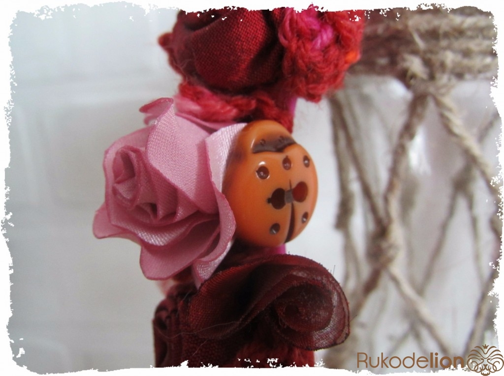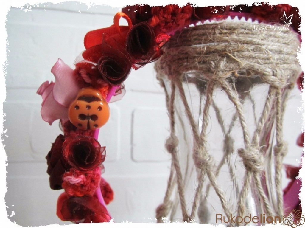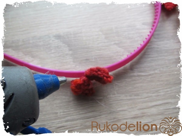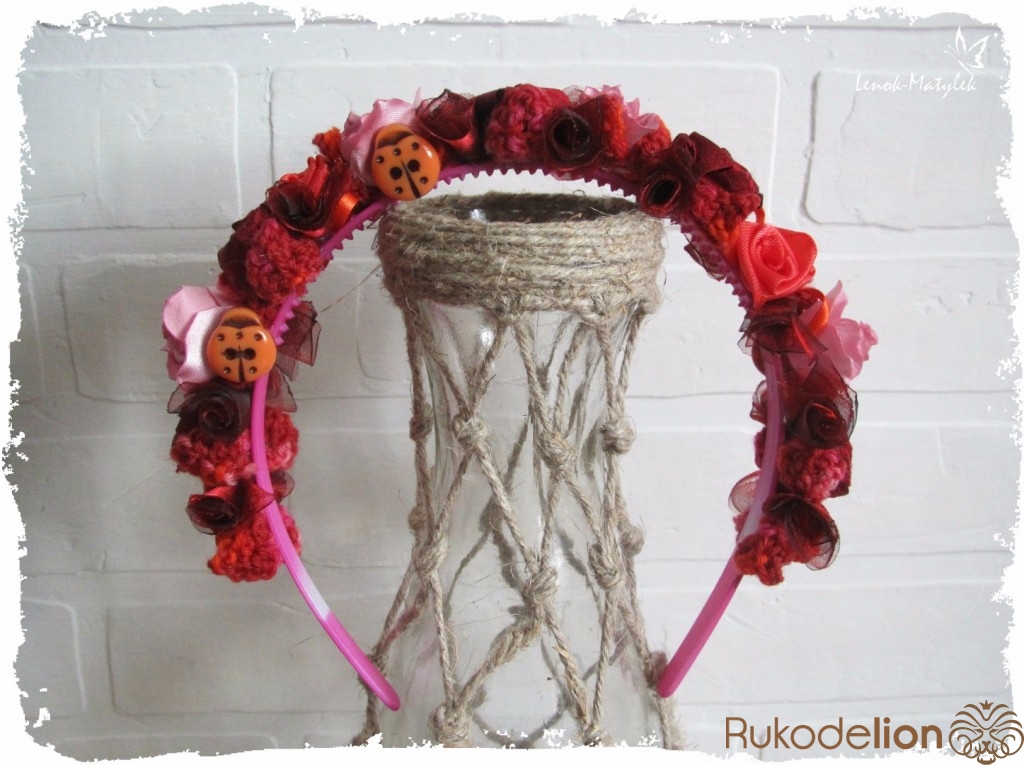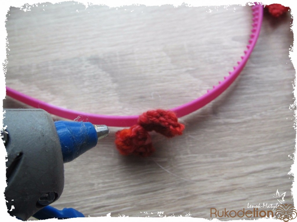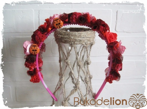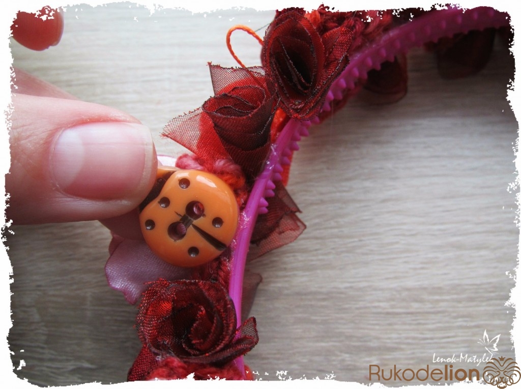 Далее при помощи изготовленных украшений и клея-пистолета преобразим наш обруч. Не забываем о божьих коровках, которые также крепим на обруч вместе с розочками и листиками.