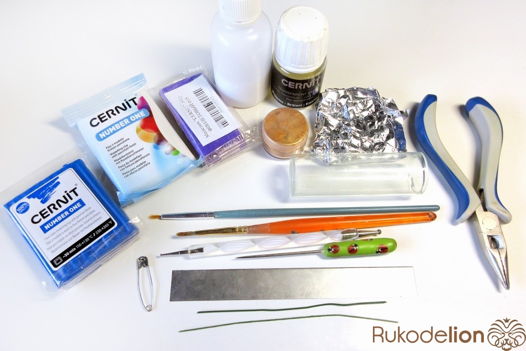 - запекаемая полимерная глина темно-синего, белого, фиолетового цвета;