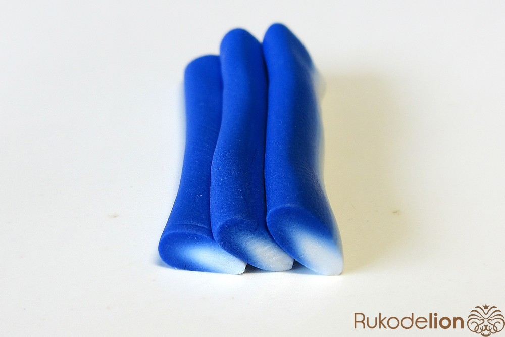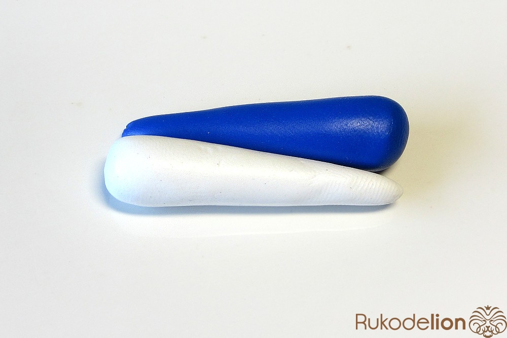 Из полимерной глины темно-синего и белого цвета сформируйте детали в форме морковки длиной 4см. Сложите их вместе, как показано на фото.