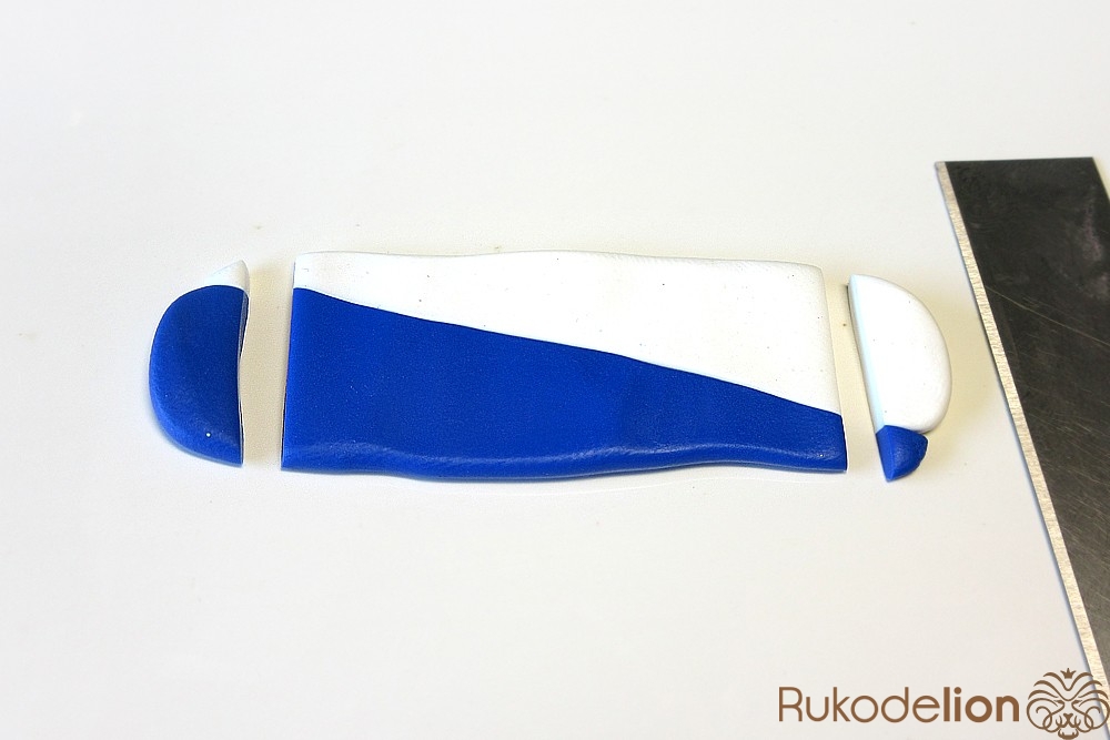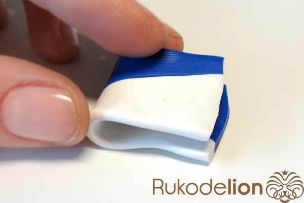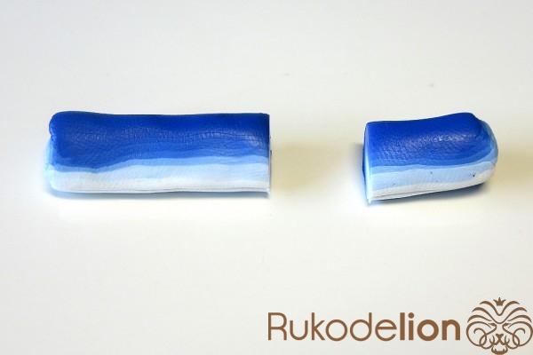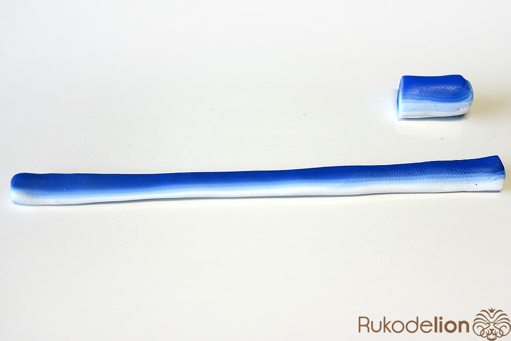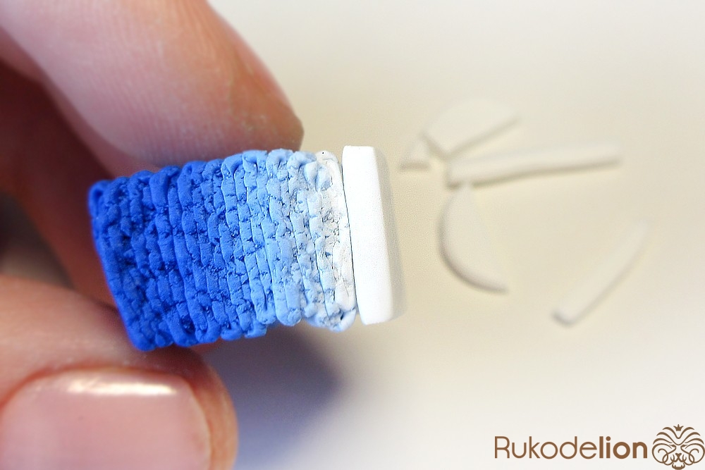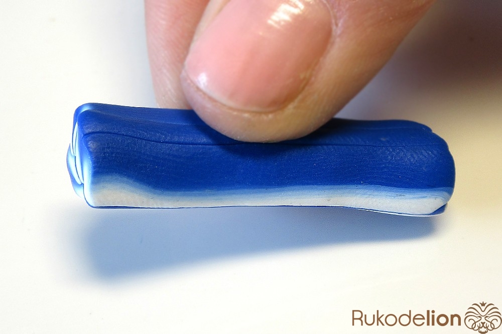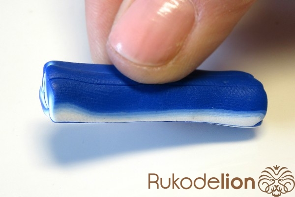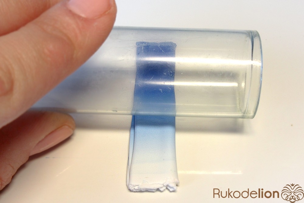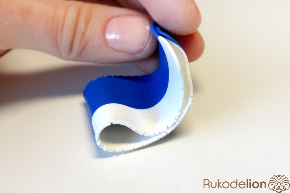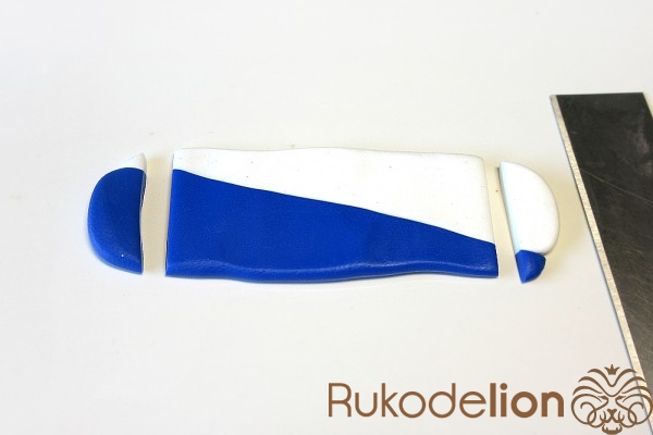 Если у получившейся детали почти нет белого цвета, а сразу начинается светло-голубой, то в этом случае раскатайте кусочек глины в пласт толщиной 2мм, приложите его к светлой части заготовки и по краям обрежьте лишнее.