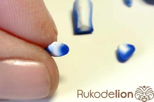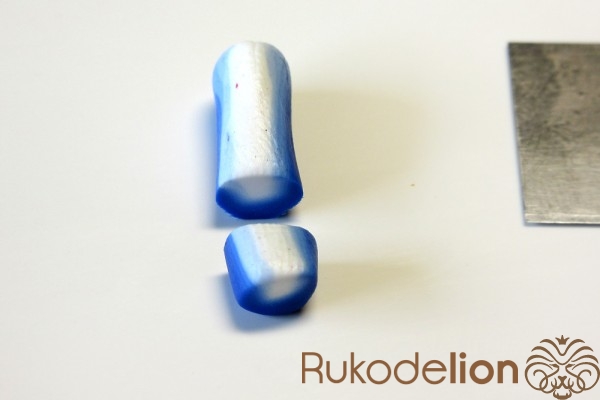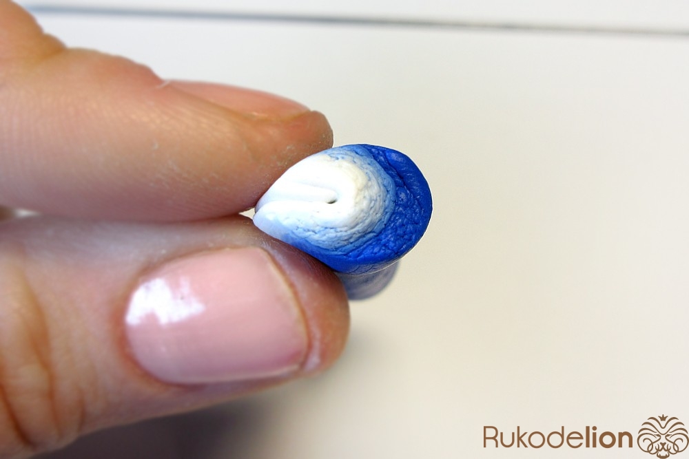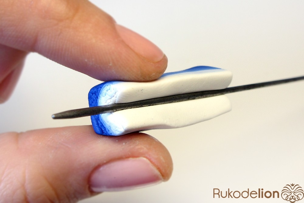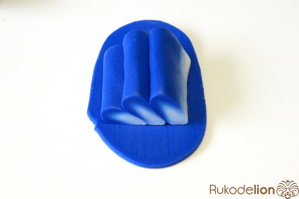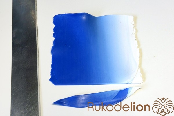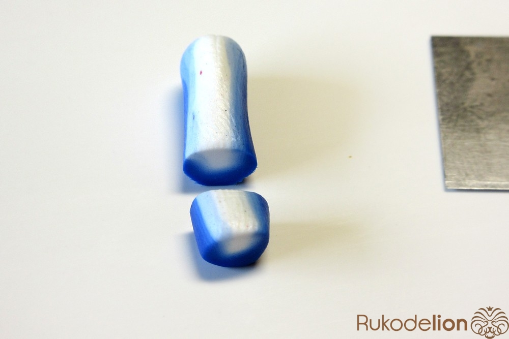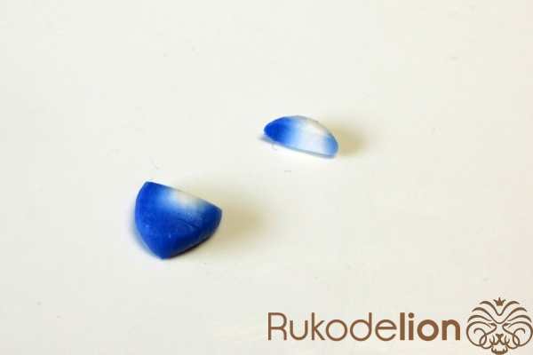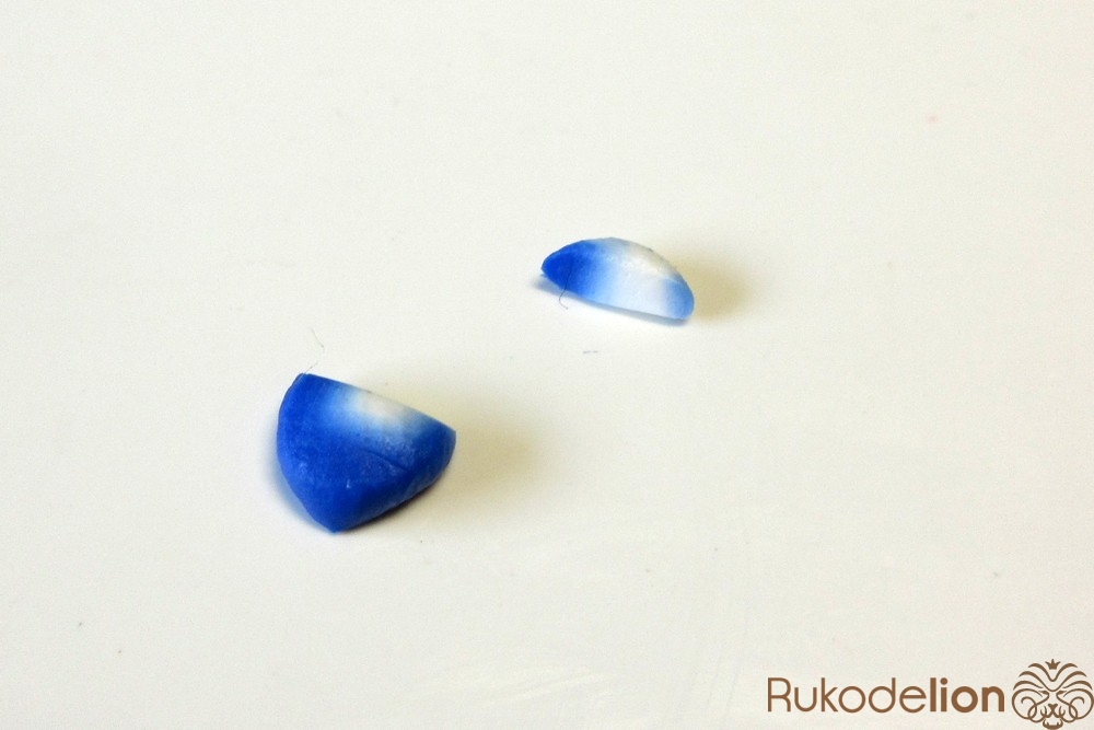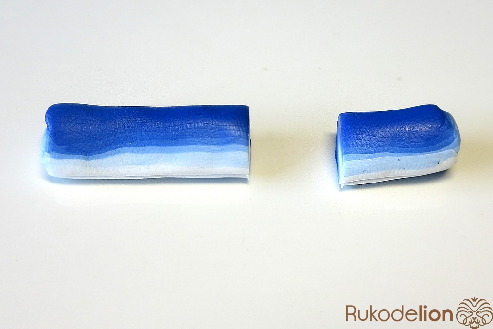 Если у получившейся детали почти нет белого цвета, а сразу начинается светло-голубой, то в этом случае раскатайте кусочек глины в пласт толщиной 2мм, приложите его к светлой части заготовки и по краям обрежьте лишнее.