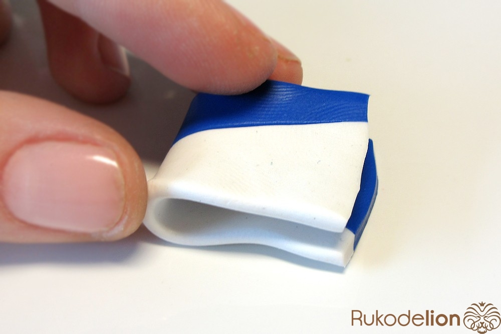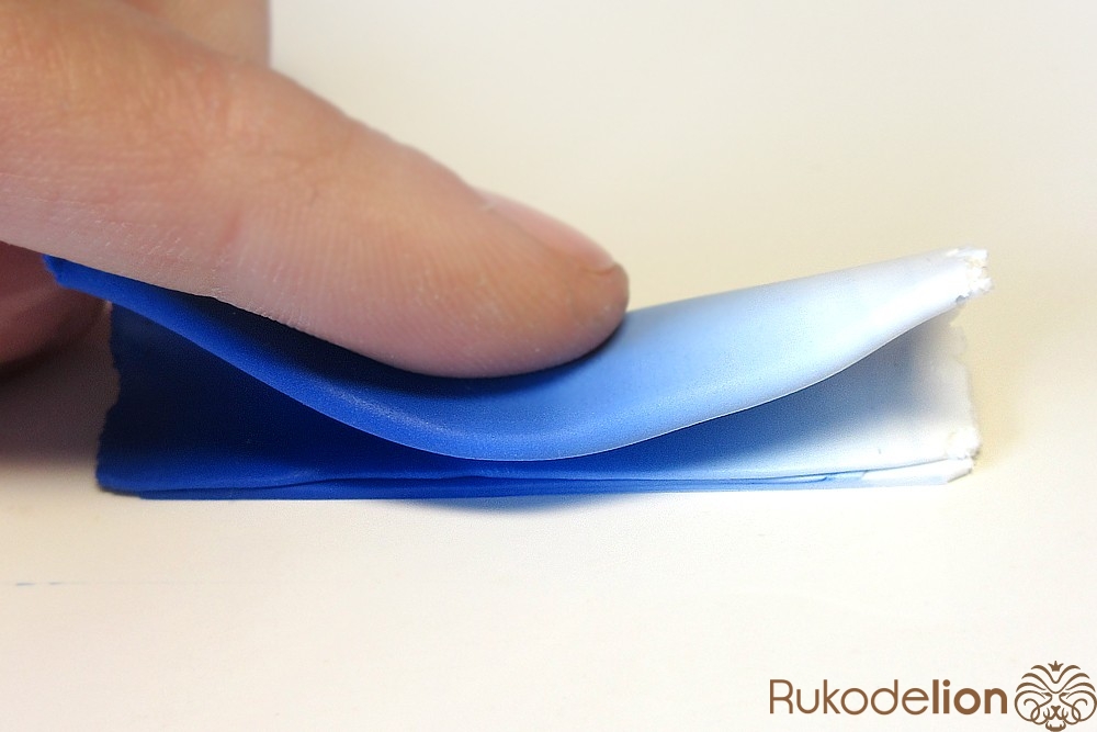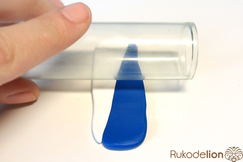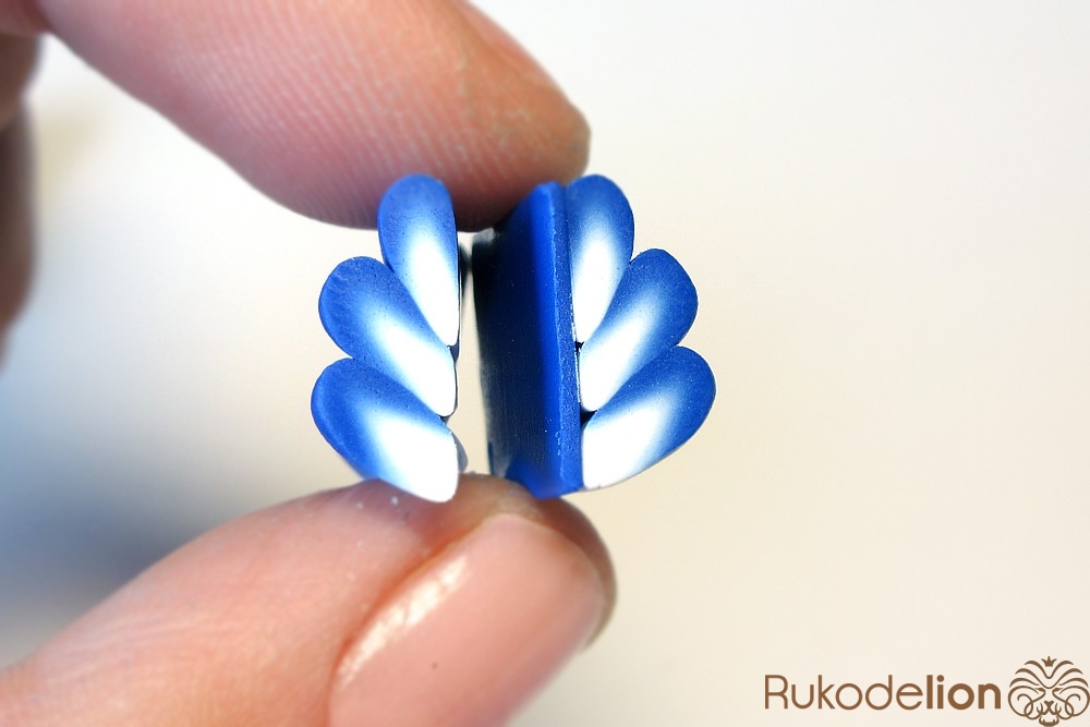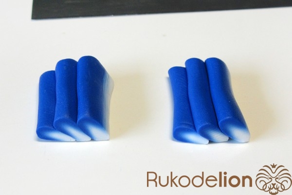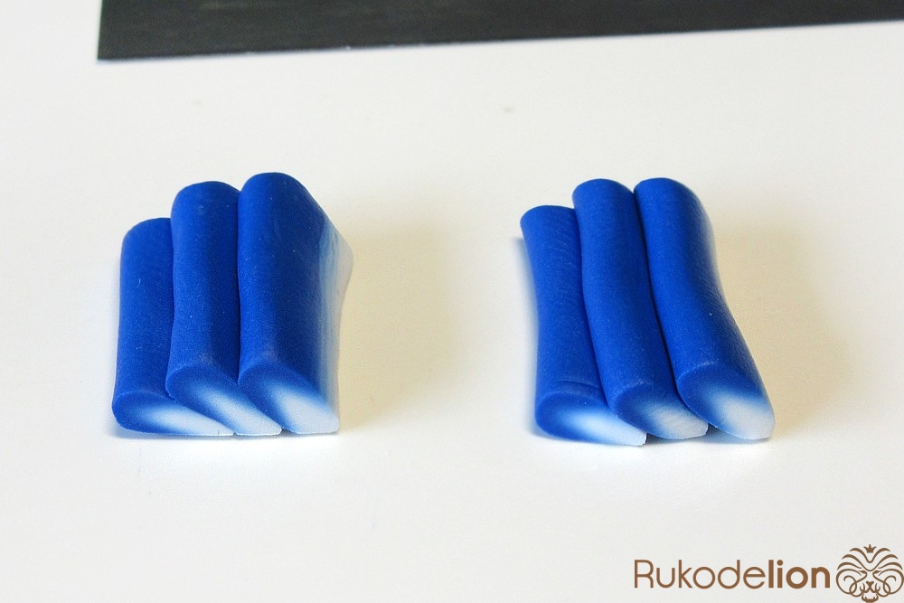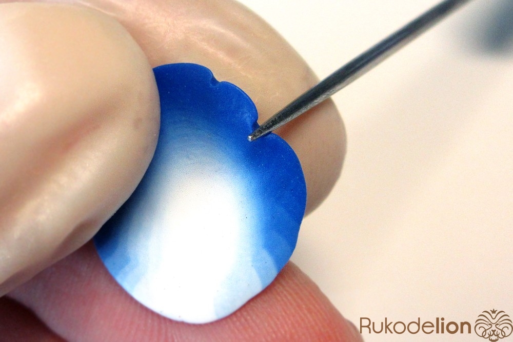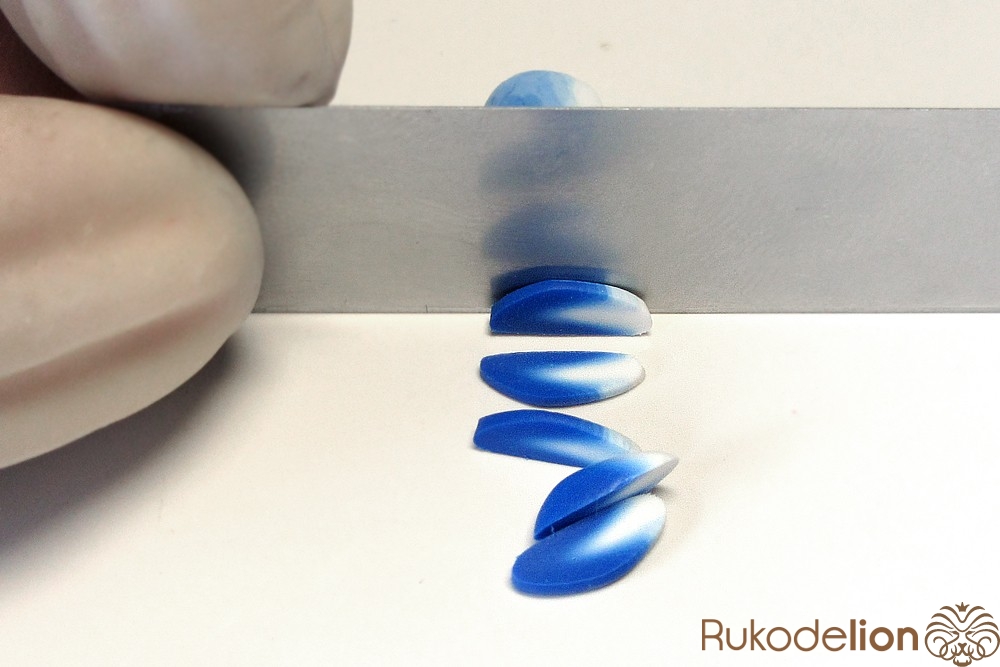 Если у получившейся детали почти нет белого цвета, а сразу начинается светло-голубой, то в этом случае раскатайте кусочек глины в пласт толщиной 2мм, приложите его к светлой части заготовки и по краям обрежьте лишнее.