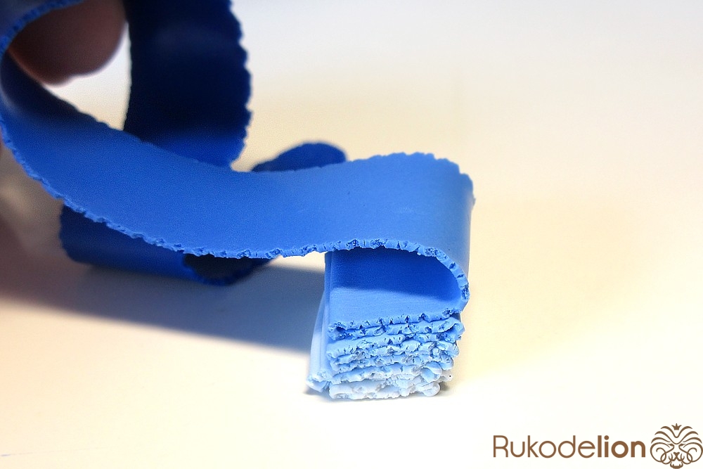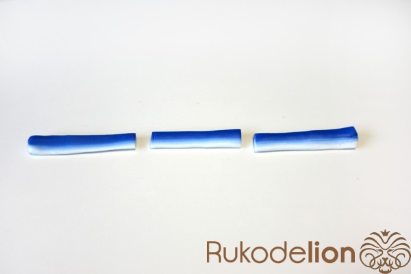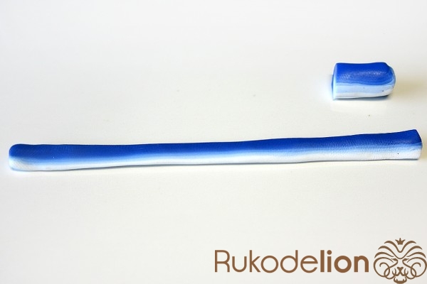 Раскатайте ее в длину, стараясь раскатывать как можно тоньше, чтобы у вас в итоге вышла очень тонкая и длинная лента, в которой цвет переходит от белого к темно-синему.