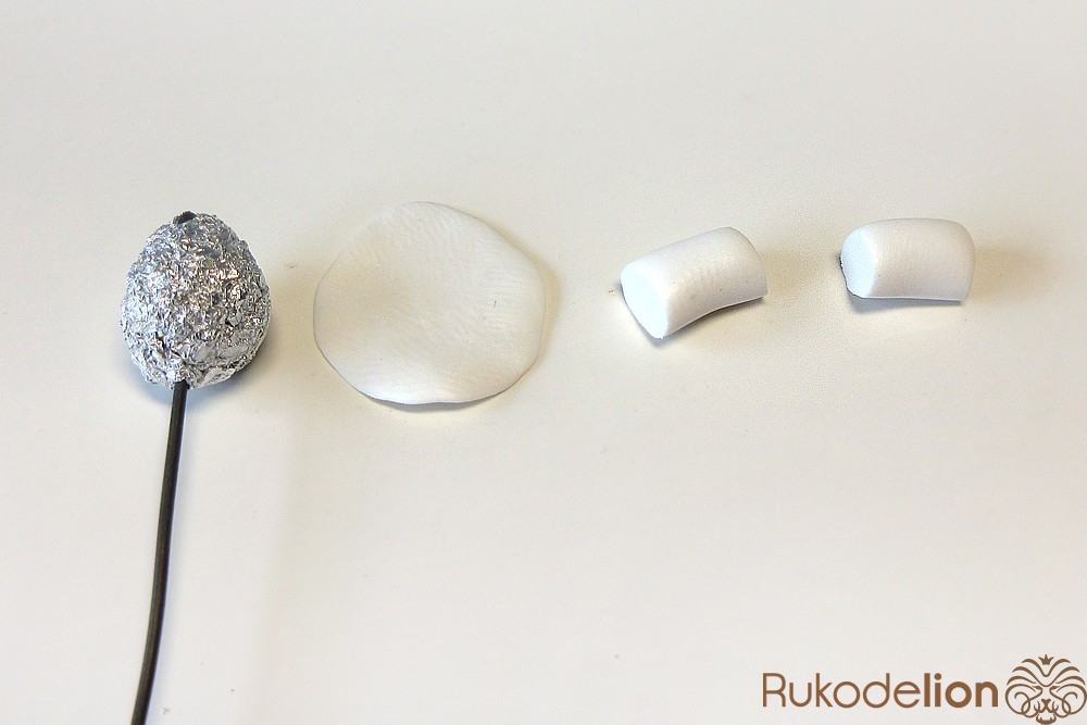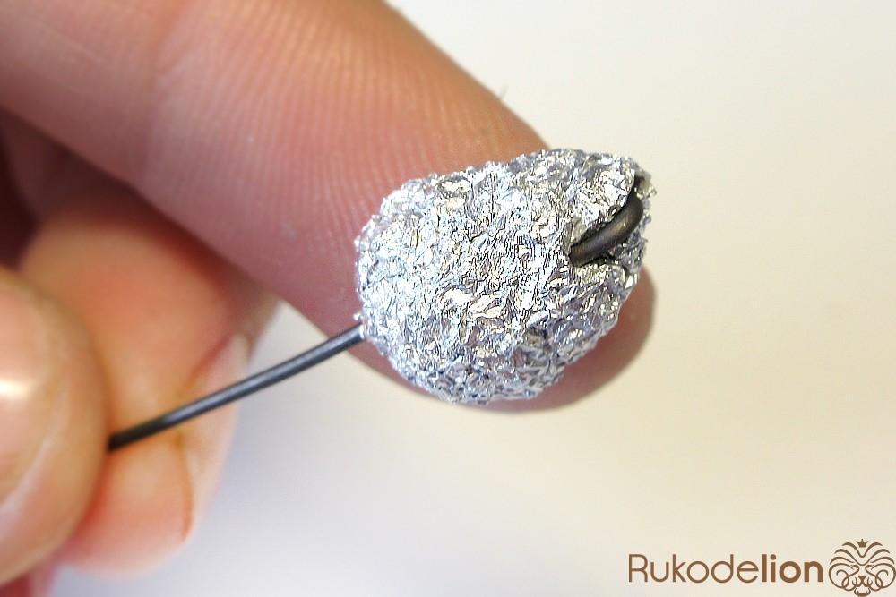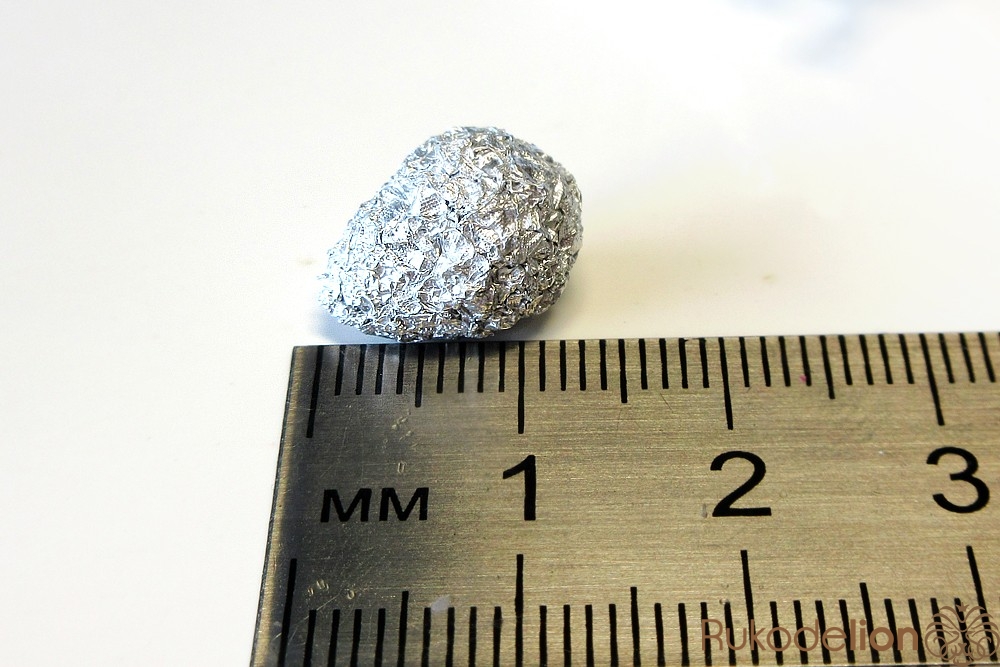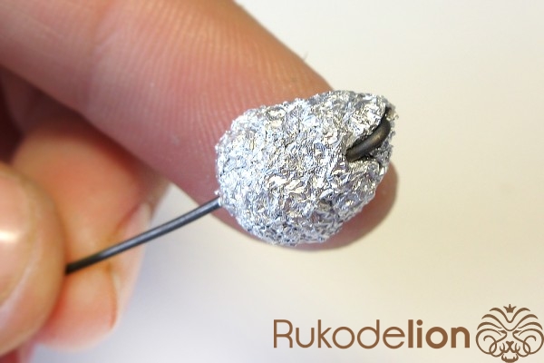 Теперь займемся бутоном. Для него возьмите кусок мягкой фольги и сформируйте из нее деталь в форме яйца длиной 1-1,2см.