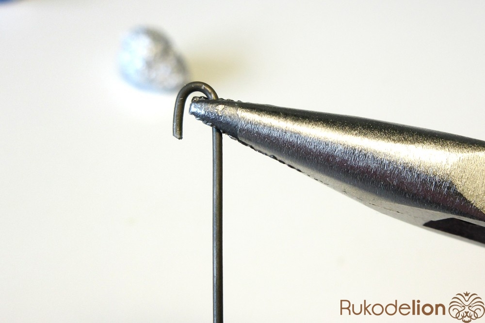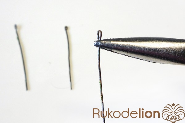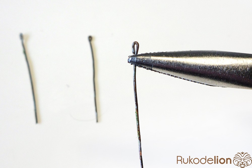 От более тонкой проволоки отрежьте три кусочка длиной 4см и плоскогубцами сделайте маленькую петельку на конце каждого отрезка.