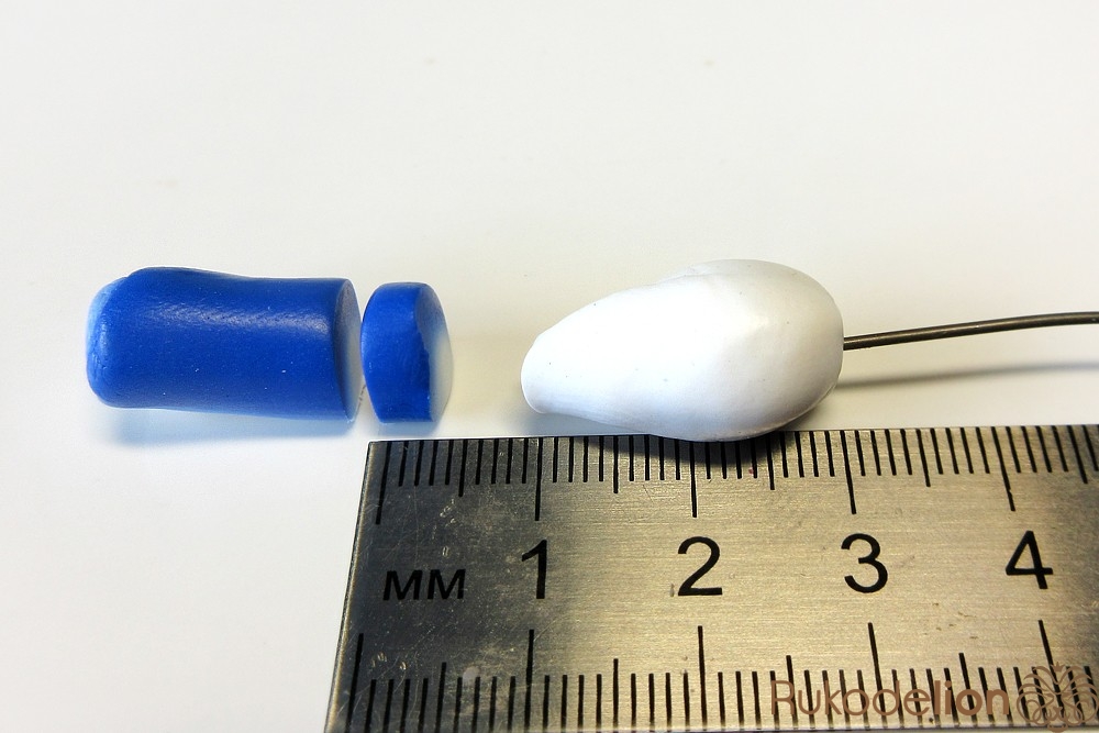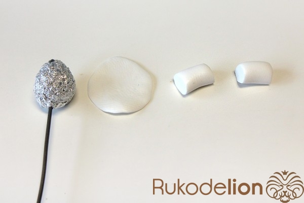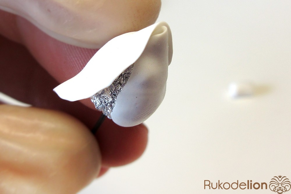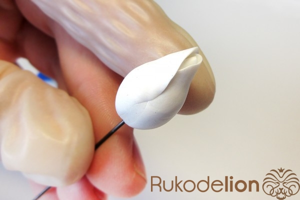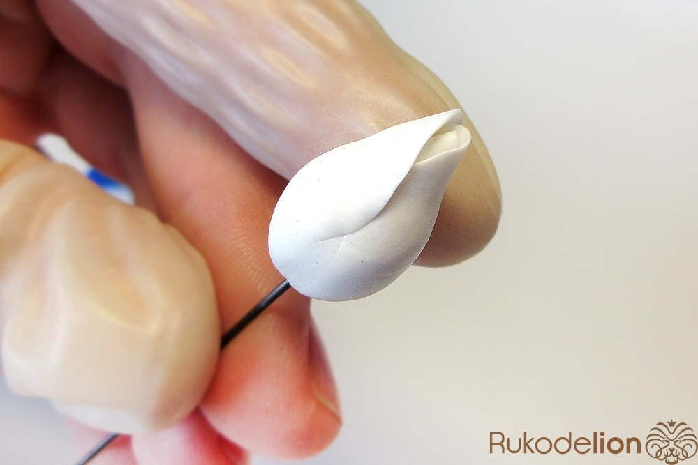 Теперь из полимерной глины белого цвета нужно сформировать три овальных лепестка, их высота должна быть на 7мм выше заготовки бутона.