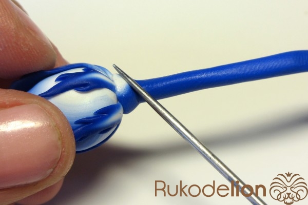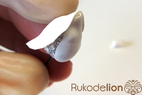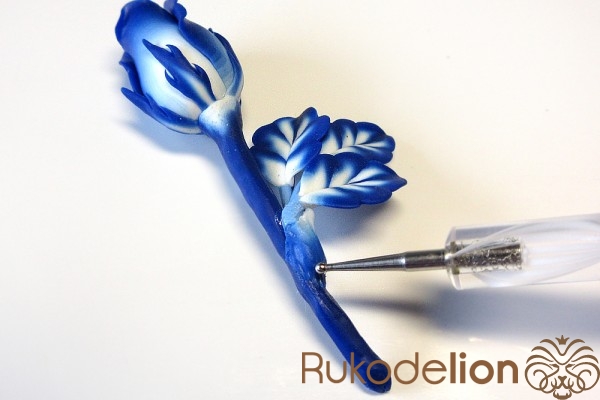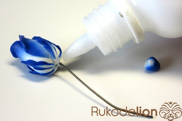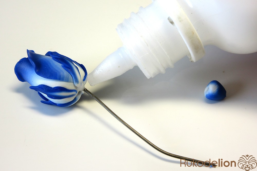 Нижнюю часть бутона смажьте жидкой полимерной глиной.