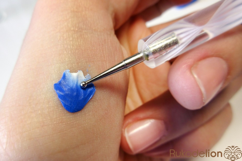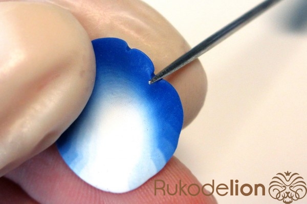 Придавите кусочек к основанию большого пальца и его светлый конец обработайте стеком с маленьким шариком, чтобы получился тоненький лепесток с неровным краем.