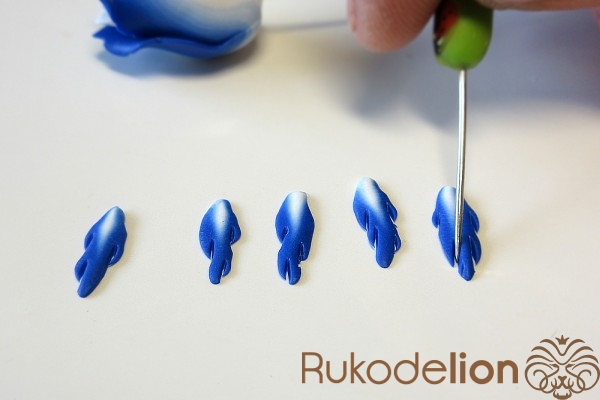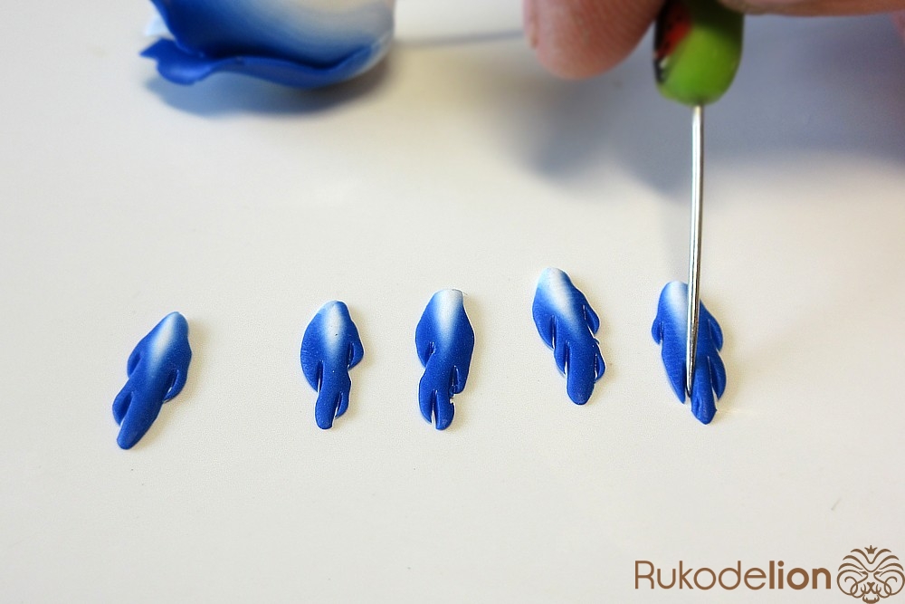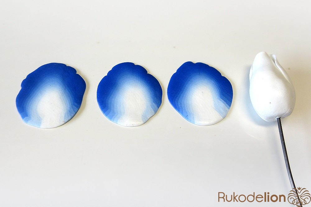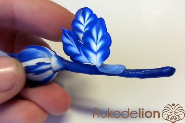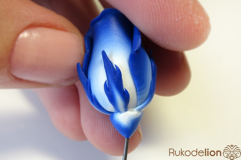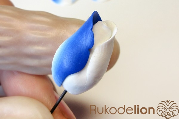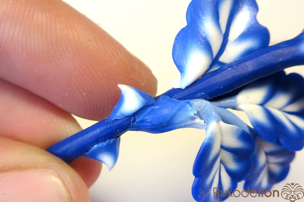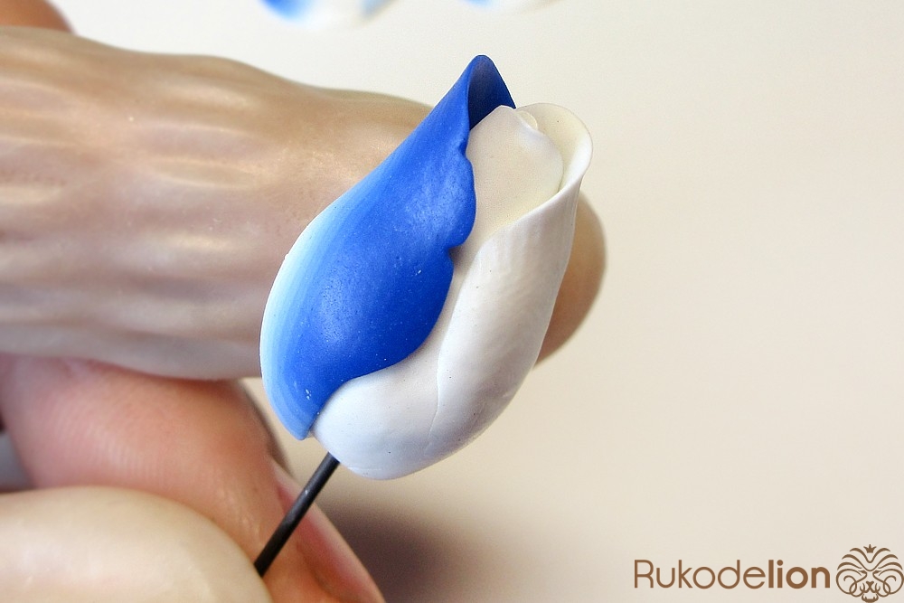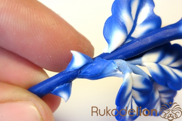 Концы голубых стеблей закройте подготовленной деталью светлым концом вверх, а синий край пригладьте стеком к стеблю.