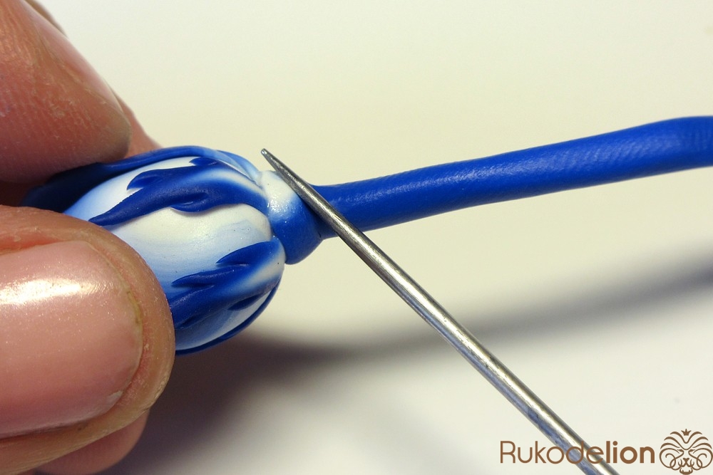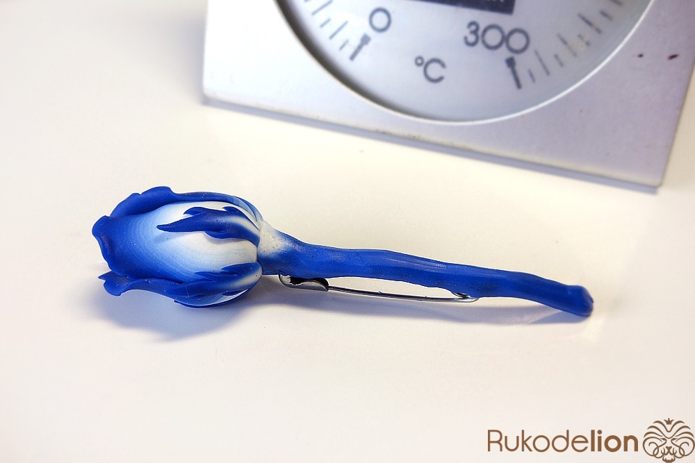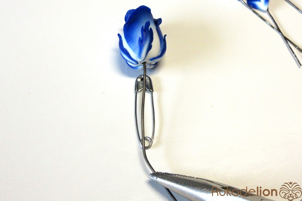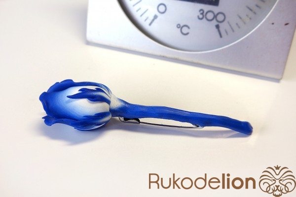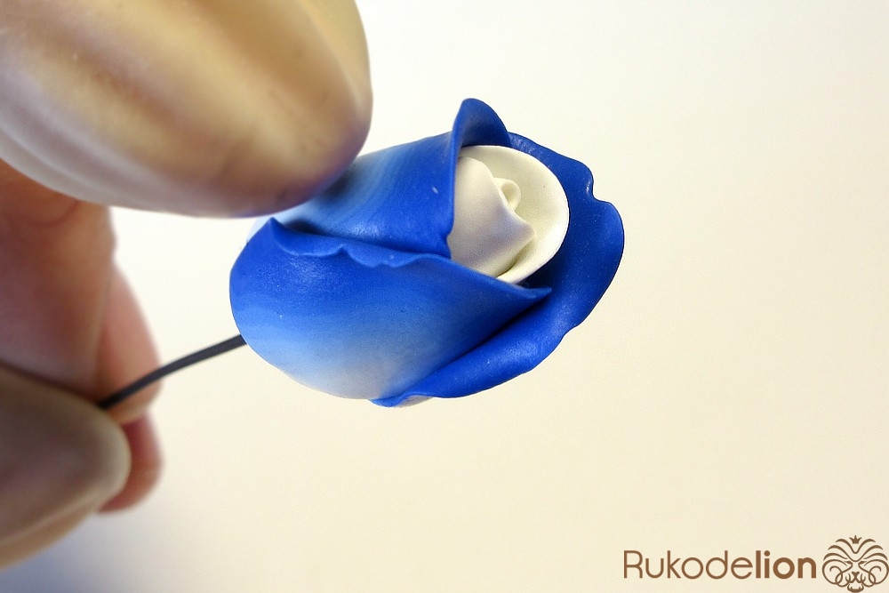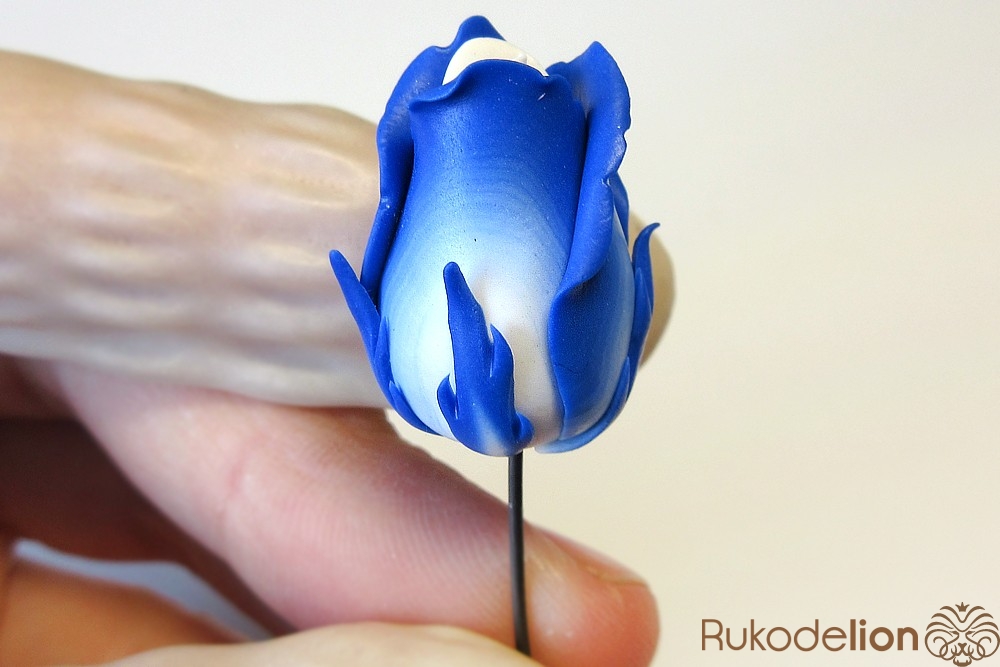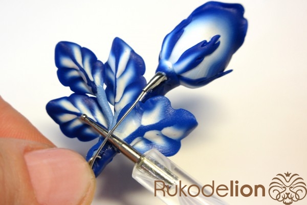 Наденьте ее на стебель, место стыка с бутоном сгладьте толстой иглой и глину растяните по проволоке, чтобы получился стебель толщиной около 4мм (важно не сделать его слишком тонким, иначе не получится закрепить булавку).