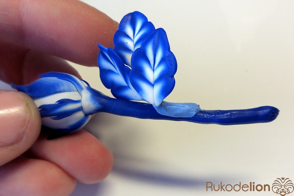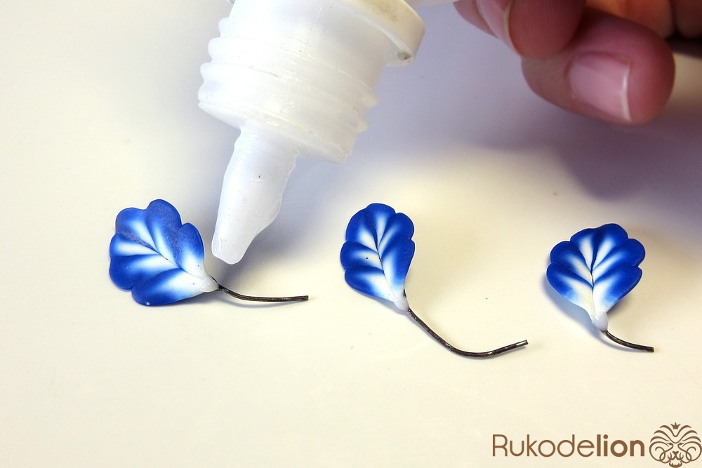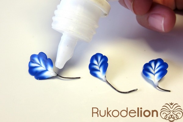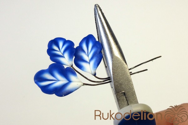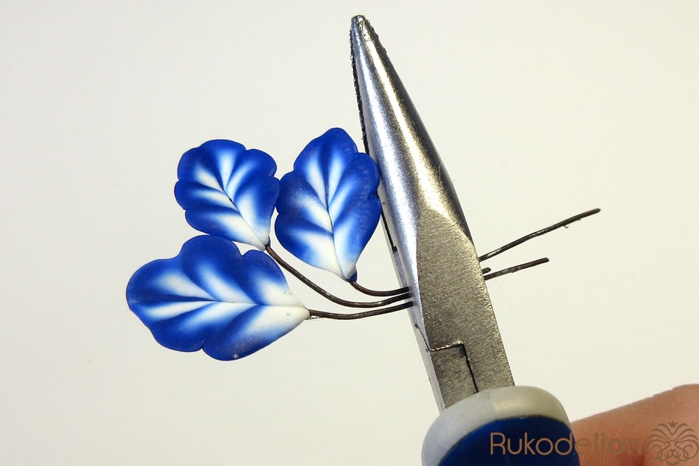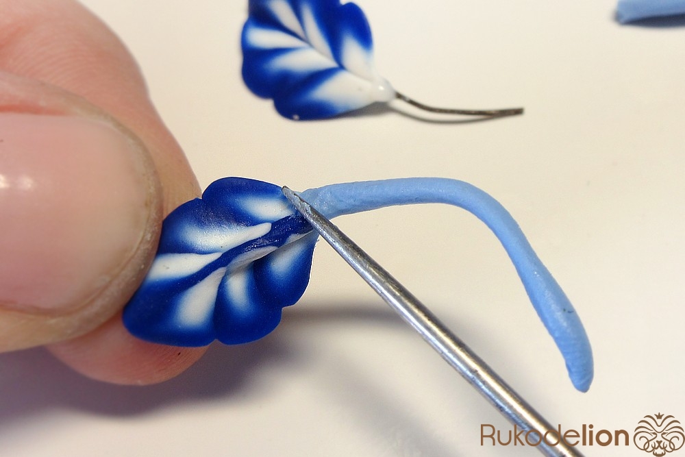 Смешайте кусочек белой глины с синей, чтобы получился голубой цвет. Обтяните голубой глиной проволоку каждого листика и иглой сгладьте место стыка голубой глины с листом.