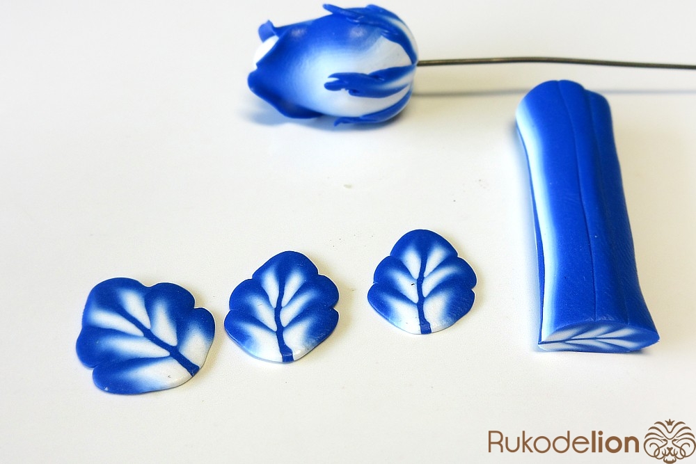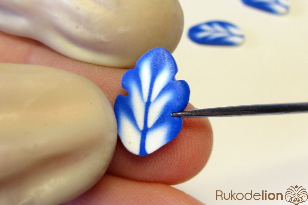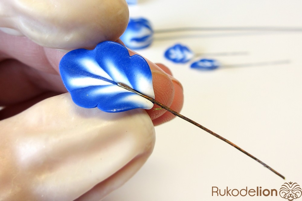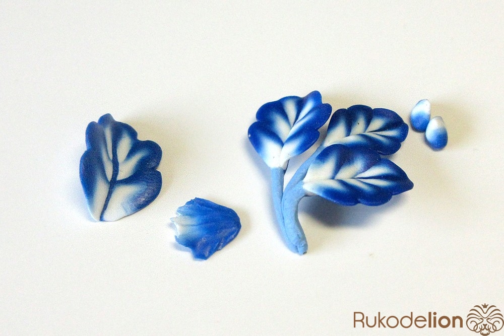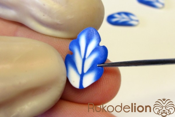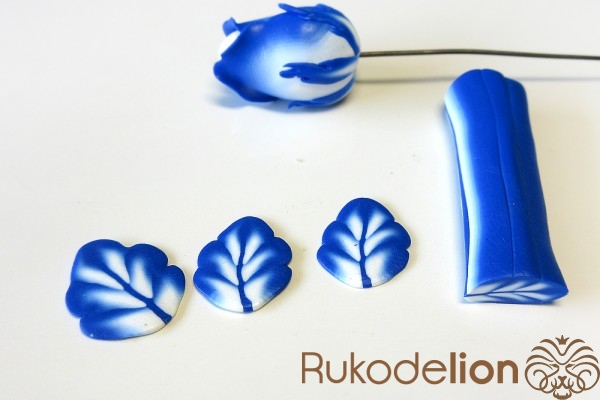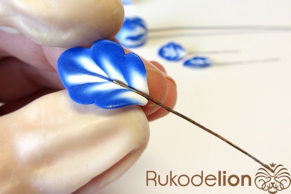 Смешайте кусочек белой глины с синей, чтобы получился голубой цвет. Обтяните голубой глиной проволоку каждого листика и иглой сгладьте место стыка голубой глины с листом.