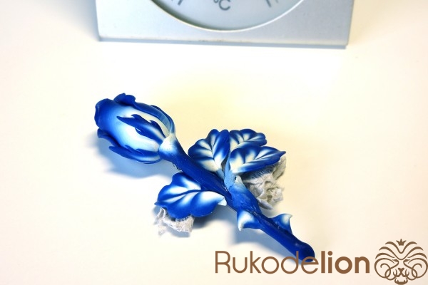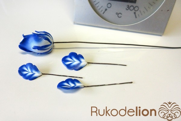 Так же прикрепите проволоку и к двум остальным листьям. Затем бутон и листья запеките 15 минут при температуре, указанной на упаковке глины.
