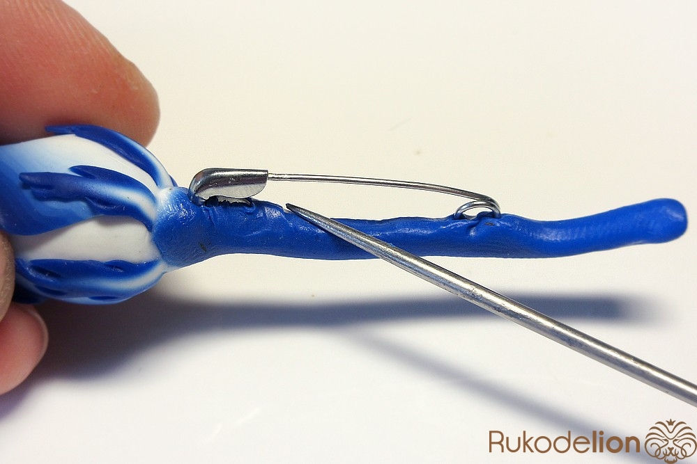Вдавите булавку в тыльную сторону стебля, сгладьте неровности глины толстой иглой так, чтобы булавка прочно зафиксировалась и после запекания не шевелилась.