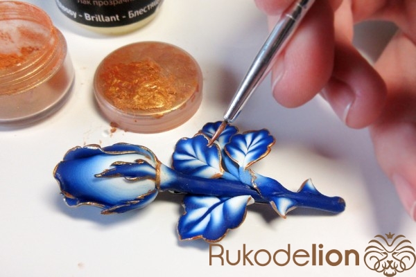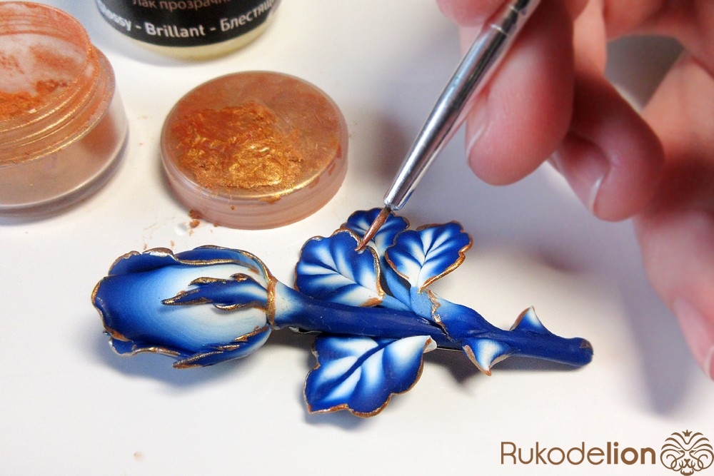 Края всех деталей запеченной розы нужно окрасить смесью из лака для полимерной глины и перламутрового пигмента золотого цвета.