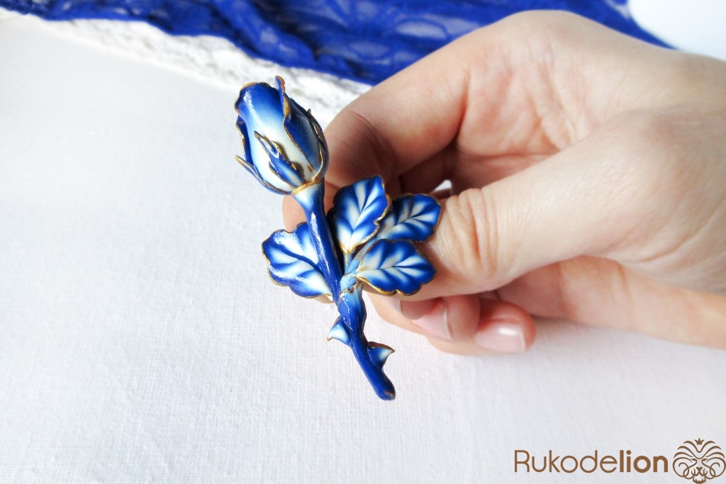 В этом мастер-классе вы увидите, как из полимерной глины создать очень оригинальную и стильную брошь в виде бутона розы с расцветкой в стиле «гжель».