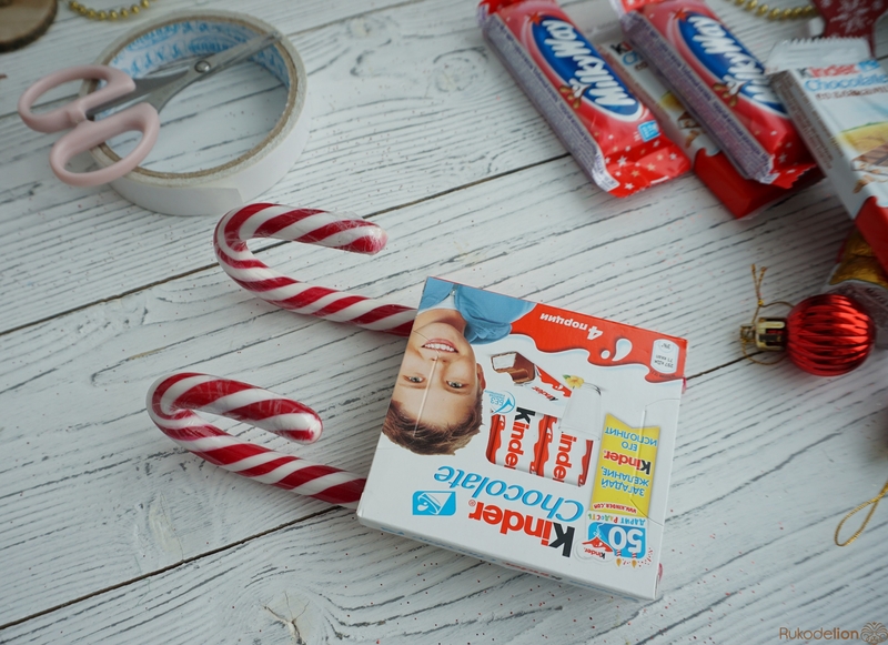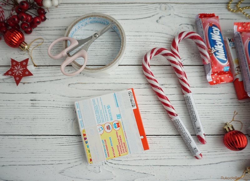 Для санок нам понадобятся карамельные трости и конфеты/шоколадки, двусторонний скот. Если ребенок не ест сладкое, конфеты можно заменить на злаковые/фруктовые/ореховые батончики.