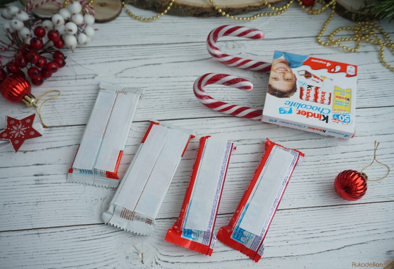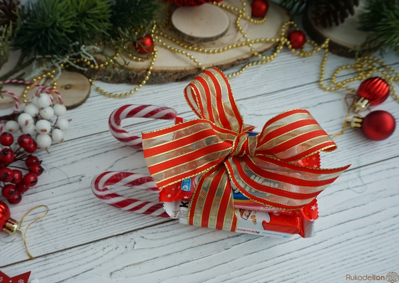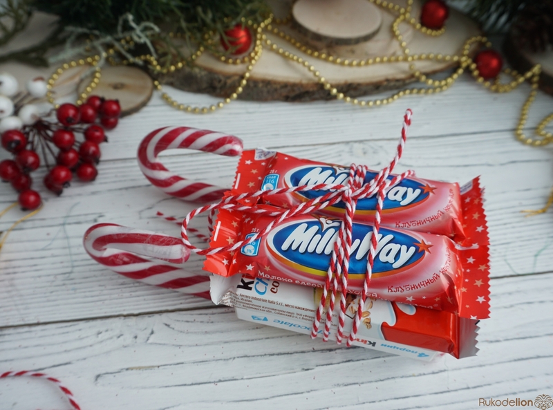 Процесс очень простой и увлекательный. При помощи двустороннего скотча приклеиваем к основе трости-полозья и конфеты, которые мы подобрали для саночек.-