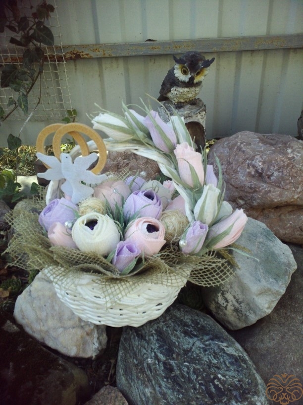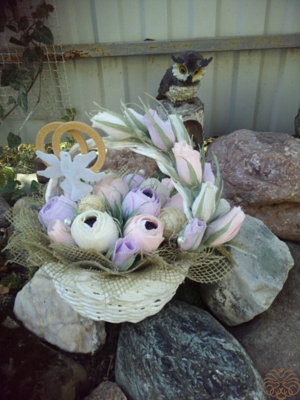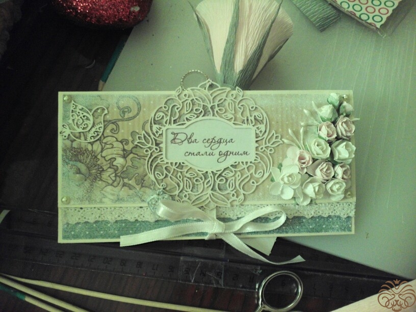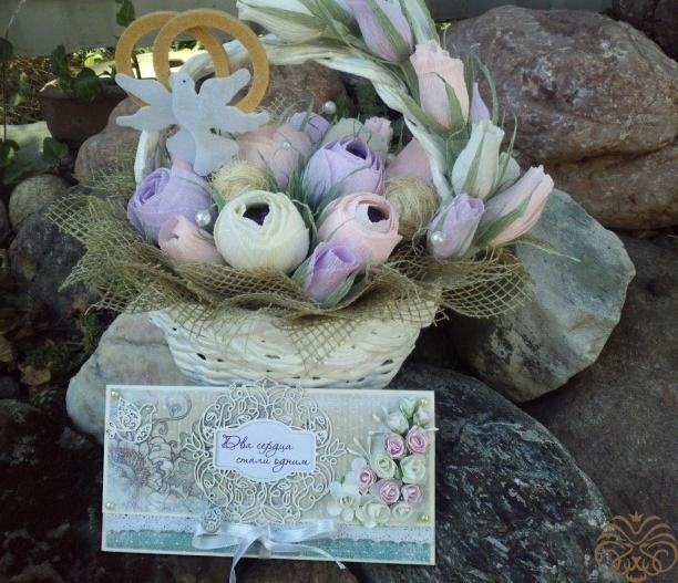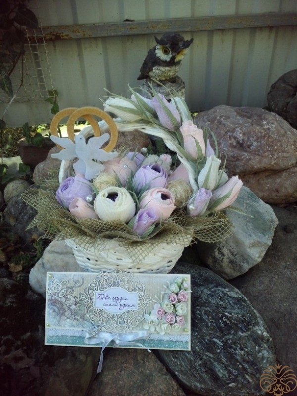 Подарок на свадьбу нашим друзьям. Для очень нежной и изящной невесты как нельзя лучше подходит стиль шебби шик. Конфетные букеты уже делала несколько раз, а конверт для денежек моя первая работа в технике скрапбукинга. Корзинка сплетена из бумажной лозы моей мамой. Молодожёнам очень понравилось, надеюсь вам тоже.