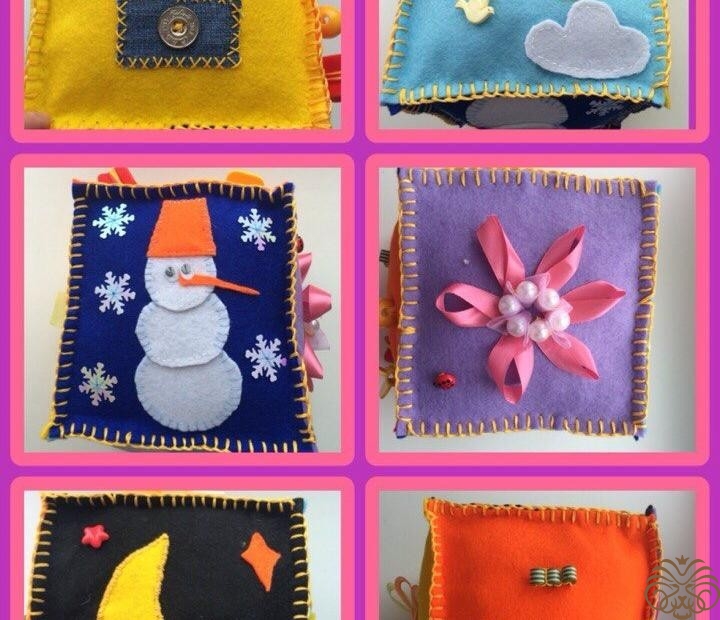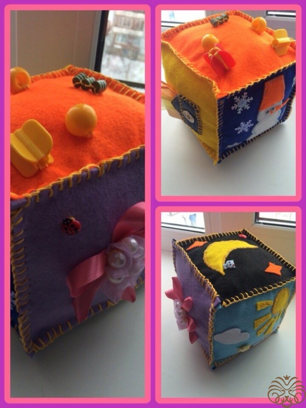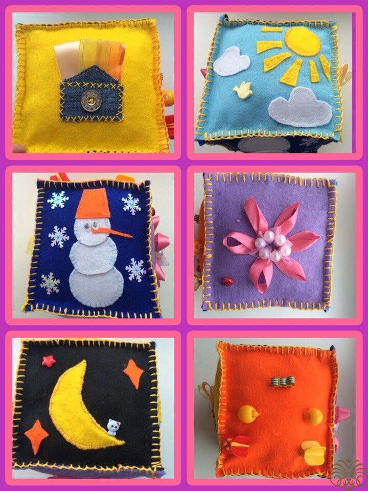 Детская игрушка из фетра, на каждой стороне разные украшения, обозначают лето (цветок), зима (снег, снеговик), день, ночь, пуговки и ленточки. Внутри синтепон.