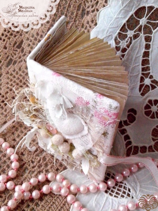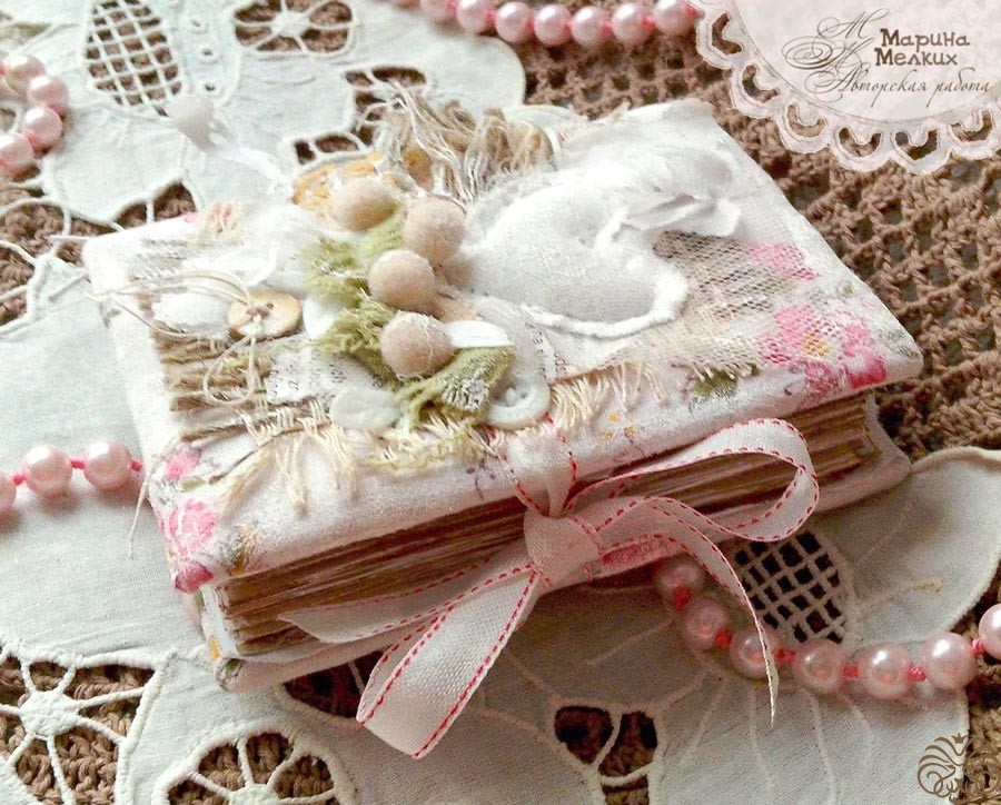 Миниатюрные размеры - 8 на 11 на 3 см. - Для записи самых сокровенных девичьих секретиков, завязывается на ленты бантиком. Обложка - хлопок на мягкой подложке, украшения: кружева, сеточка, ленточки, пуговки и цветочки - будет одаривать душевным теплом свою хозяйку.