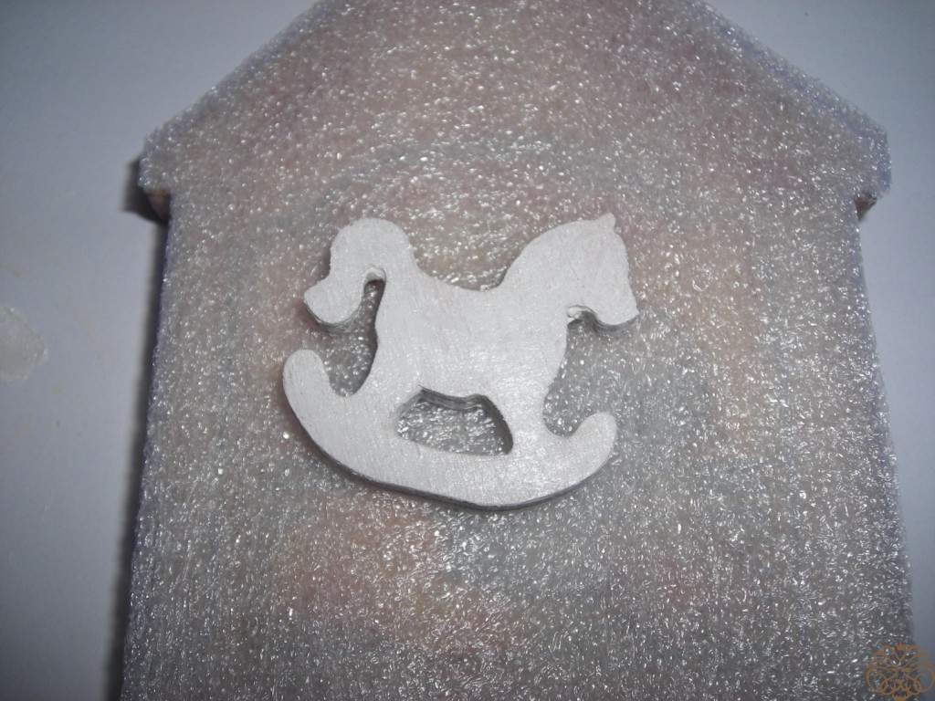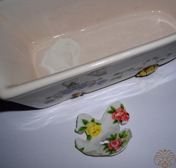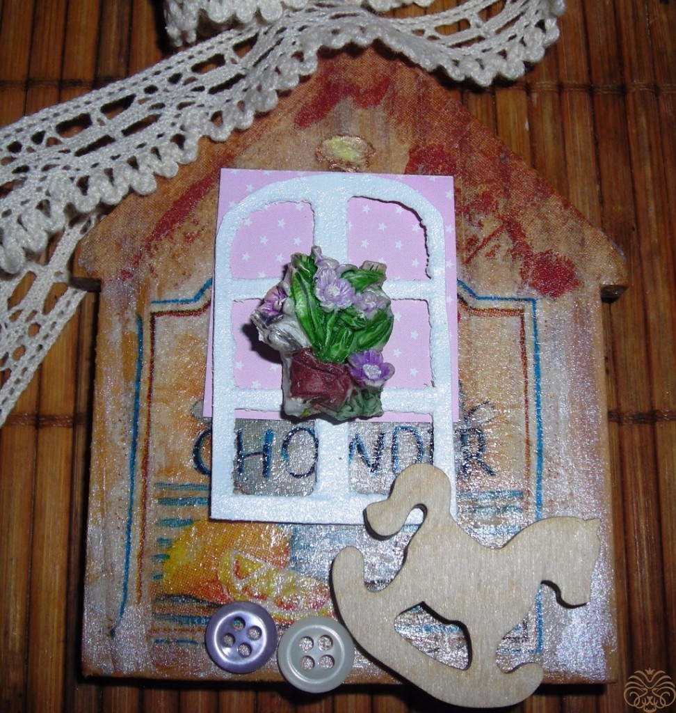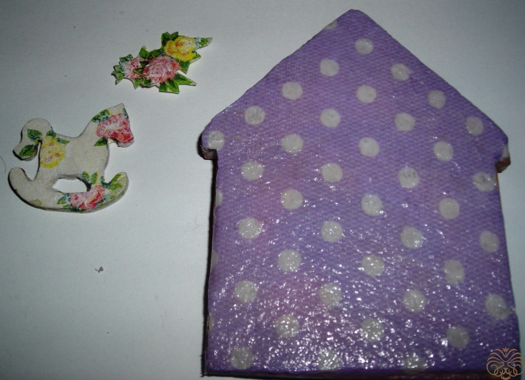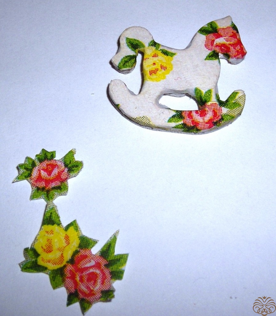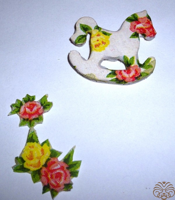 Бумажные цветы, которые я планировала использовать в данной миниатюре, оказались велики. Поэтому я вырезала цветочки из салфетки, красные и желтые розочки. Мотив тот же, что и на лошадке. Слишком яркие цветы приглушила белой акриловой краской. Далее лошадку и домик покрыла акриловым лаком три раза с перерывом на высыхание.