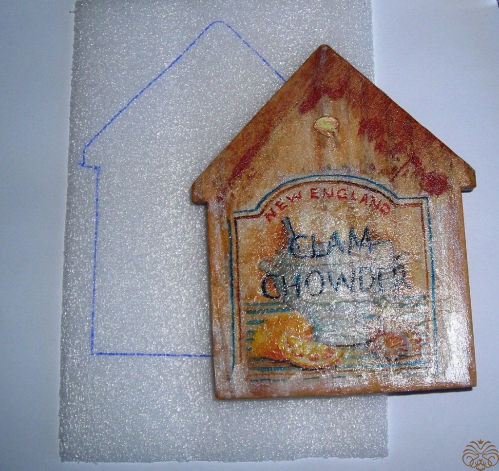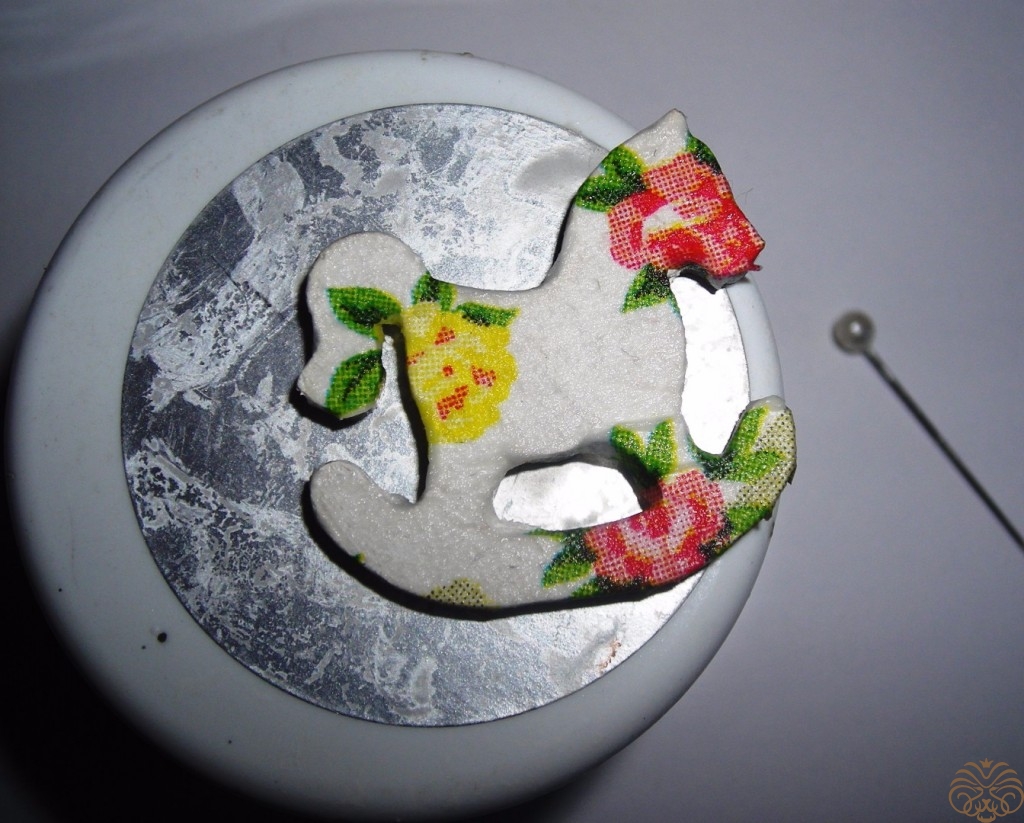 Раскладываем декоративные элементы на поверхности магнита. Магнит с неудачным декупажем. Ничего не отдирается, покрыт лаком. Есть неровные места. Решено закрыть картинку упаковочной пенкой и сделать декупаж уже на ней. Пенка белая, почти не просвечивает, мягкая, придаёт объем. Приклеиваем на ПВА, от Момента пенку разъест. После склеивания кладем под пресс до полного высыхания.