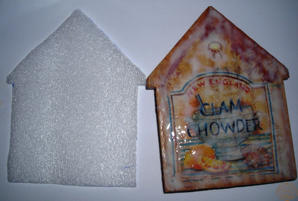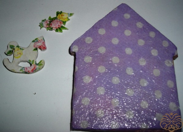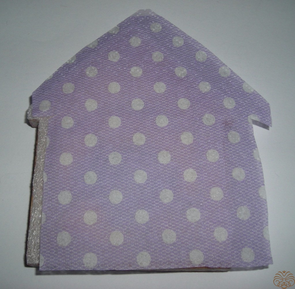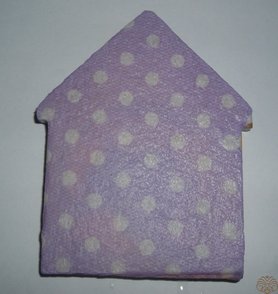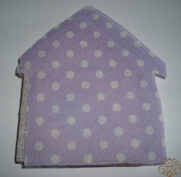 Точно также поступаем с заготовкой домика. Пенку нужно было покрасить белой краской. Это мне урок на будущее, цвет готового магнита немного получился не совсем такой, как я хотела. Салфетку в горошек приклеиваем на разбавленный ПВА к основе, прямо на пенку. Только с одной стороны. Повторюсь: если делать магнит с нуля этот шаг можно пропустить. Заготовку домика покрасить белой акриловой краской, обклеить салфеткой или скрапбумагой. Отправляем сохнуть.