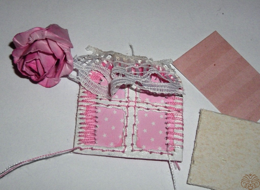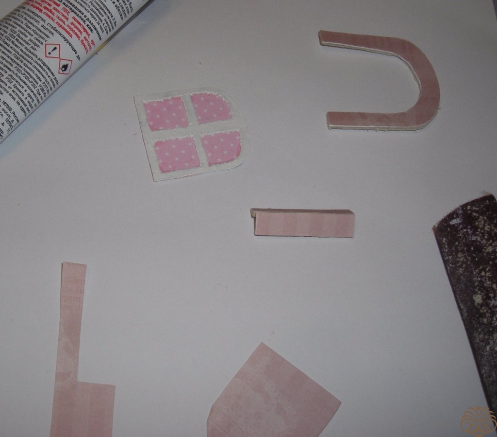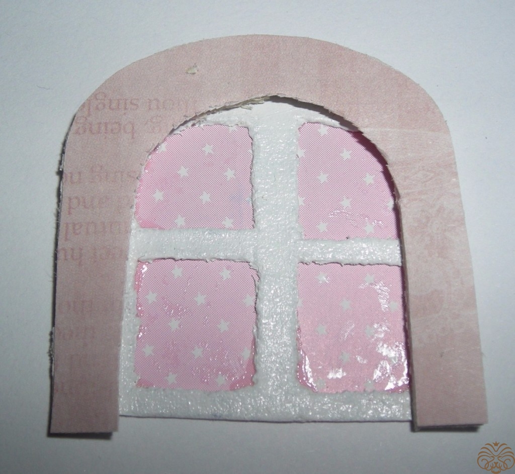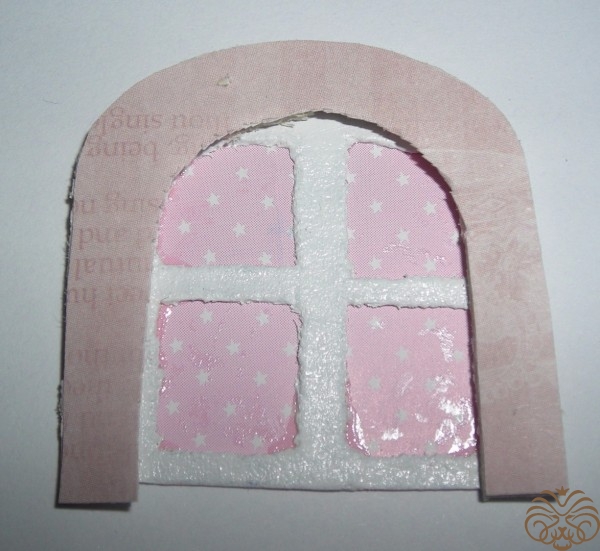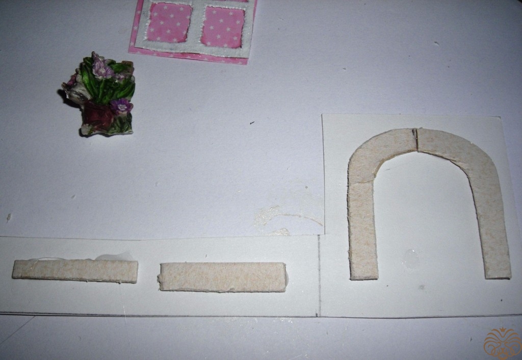 Приступаем к изготовлению окошка. Заготовка окошка уже окрашена белой акриловой краской. Из переплетного картона делаем наличники-арочку и два прямоугольника для подоконника. Подоконник объемный. На нем будет стоять горшок с цветком. Обводим, вырезаем, приклеиваем на скрапбумагу, еще раз вырезаем, склеиваем детали подоконника. Под заготовку окна подкладываем прямоугольник розовой бумаги, приклеиваем, обрезаем.
