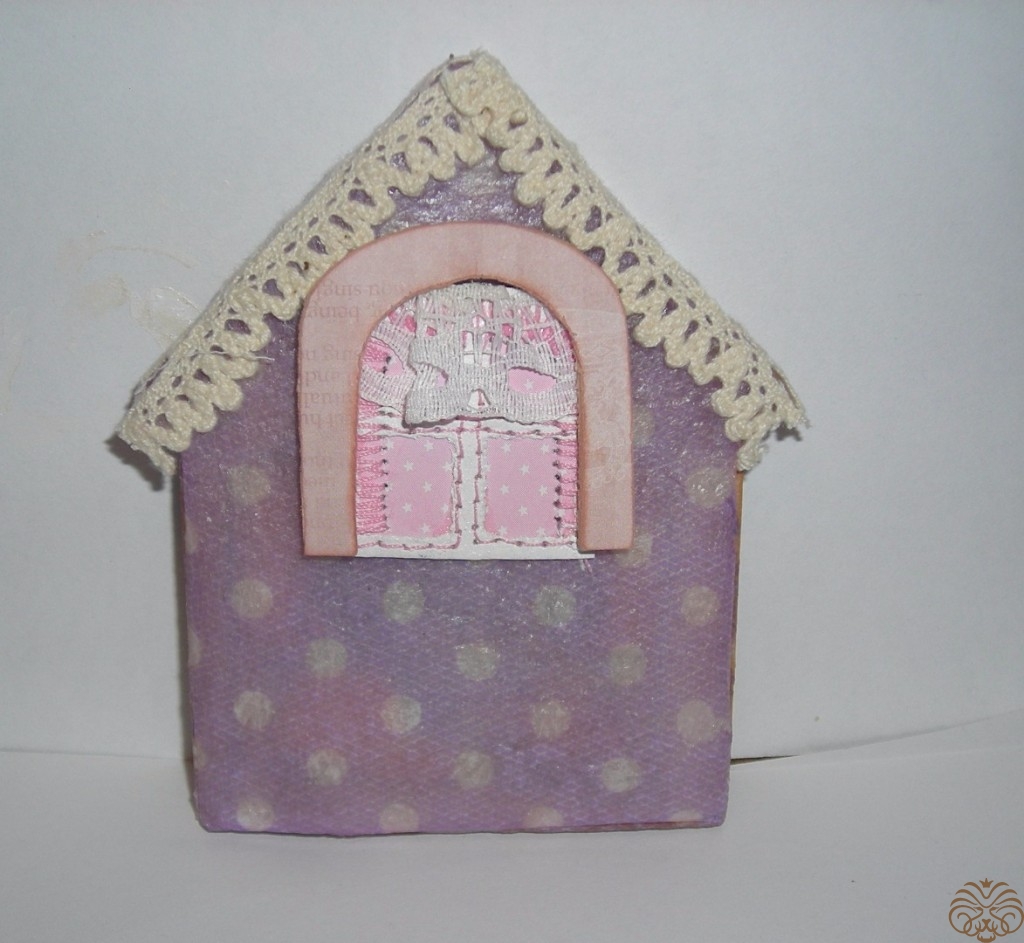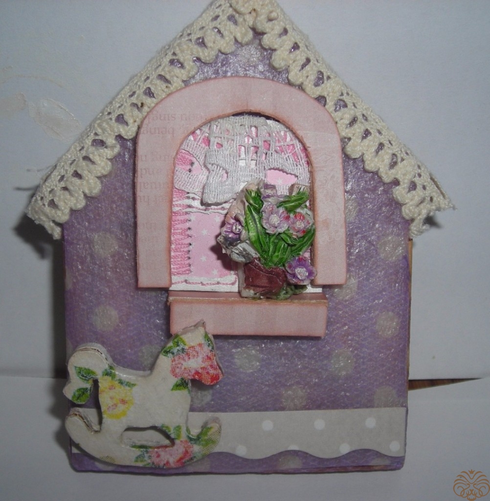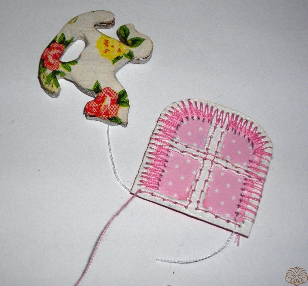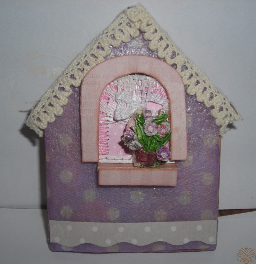 Приступаем к изготовлению окошка. Заготовка окошка уже окрашена белой акриловой краской. Из переплетного картона делаем наличники-арочку и два прямоугольника для подоконника. Подоконник объемный. На нем будет стоять горшок с цветком. Обводим, вырезаем, приклеиваем на скрапбумагу, еще раз вырезаем, склеиваем детали подоконника. Под заготовку окна подкладываем прямоугольник розовой бумаги, приклеиваем, обрезаем.