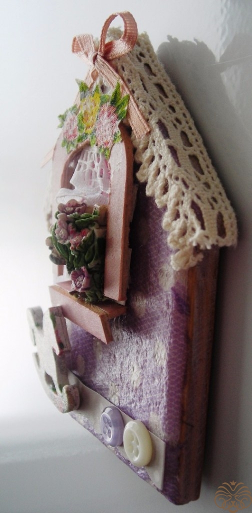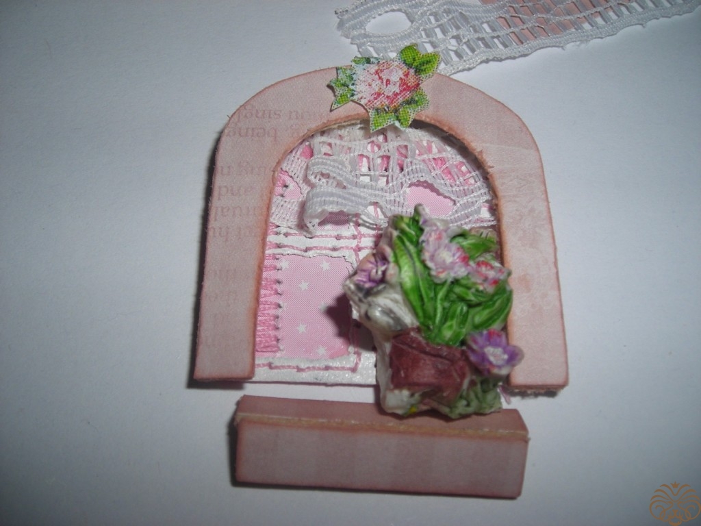 На арочку с обратной стороны наклеиваем маленькие кусочки переплетного картона для объема. Формируем окно. Арочка, подоконник немного пошкурены по краям и затонированы штемпельной подушечкой. К пенке приклеиваю на «Момент Кристалл», салфетка и слои лака не дают разъесть слой пенки. Цветок в горшке (обломок керамической фигурки) чудесно вписался, также придаёт объем. Мое окошко без подоконника - 4*4 см. Подоконник – два прямоугольника 0,7*3 см.