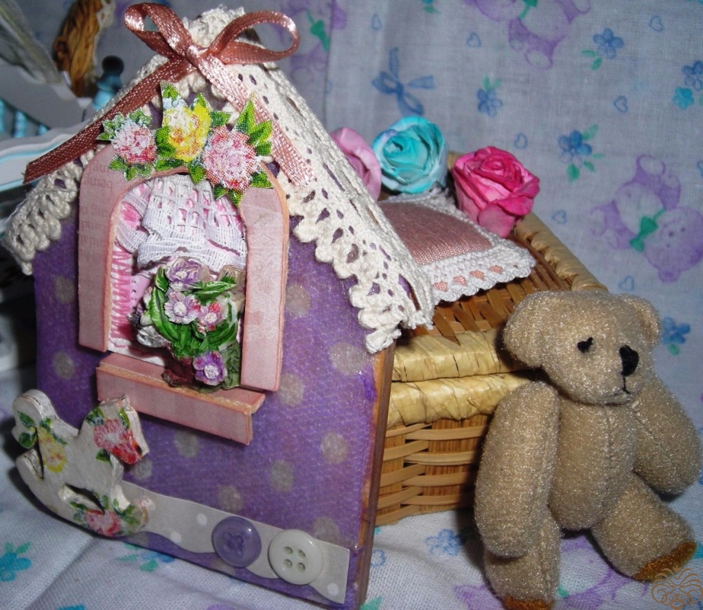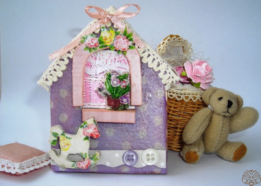 Мне очень нравится работы, оформленные в детском, очень нежном стиле (Baby). Идея моей работы – комната с окошком, подоконником, цветами на подоконнике и детскими игрушками около окошка на полу. Всё в нежных фиолетово-розово-бежевых цветах, принт в горошек и мелкий цветочек.