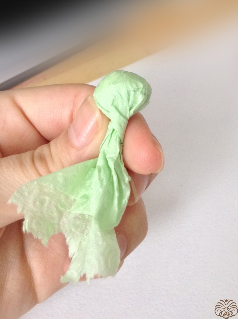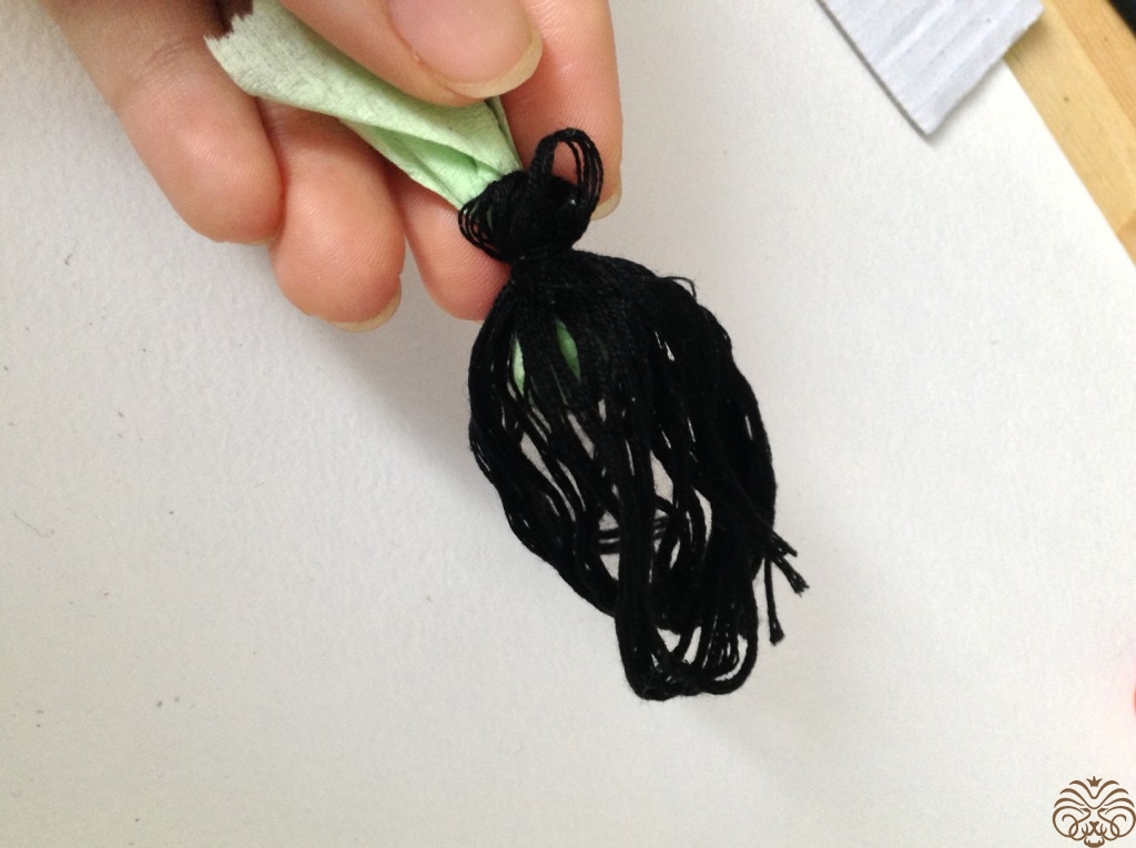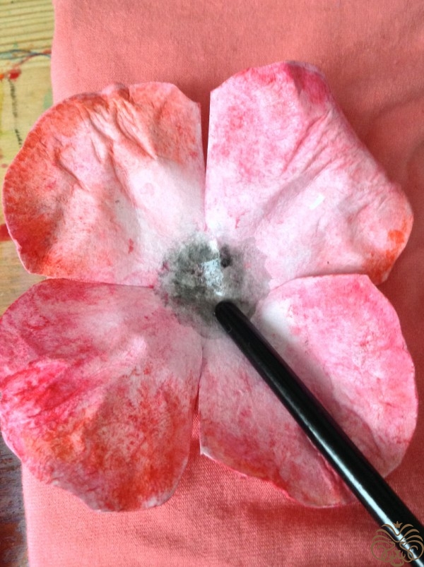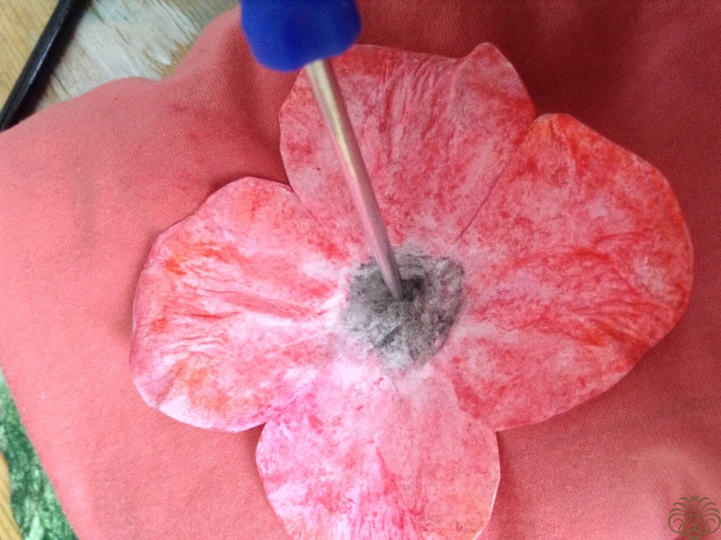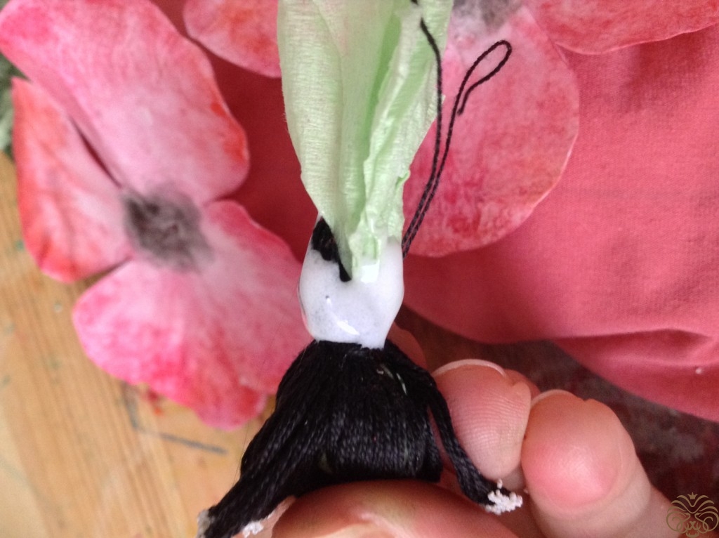 Делаем в середине венчика отверстие. Я делала шилом,но в итоге все равно подрезала ножницами,так что можно сразу ножницами немного прорезать в центре. Нашу заготовку с тычинками обмазываем клеем ПВА и продеваем в центр венчика, затем тоже самое проделываем со вторым венчиком,обрезаем лишнее и промазываем клеем с обратной стороны.