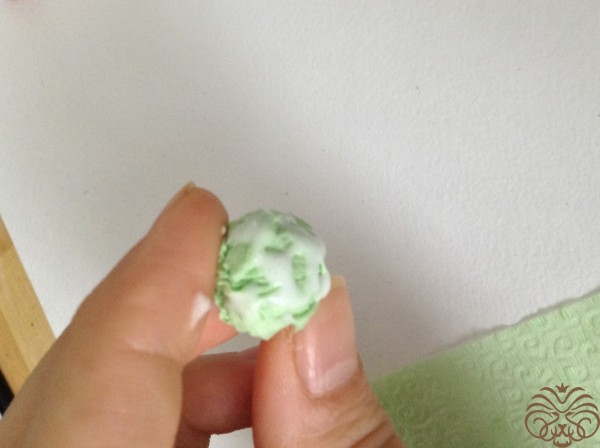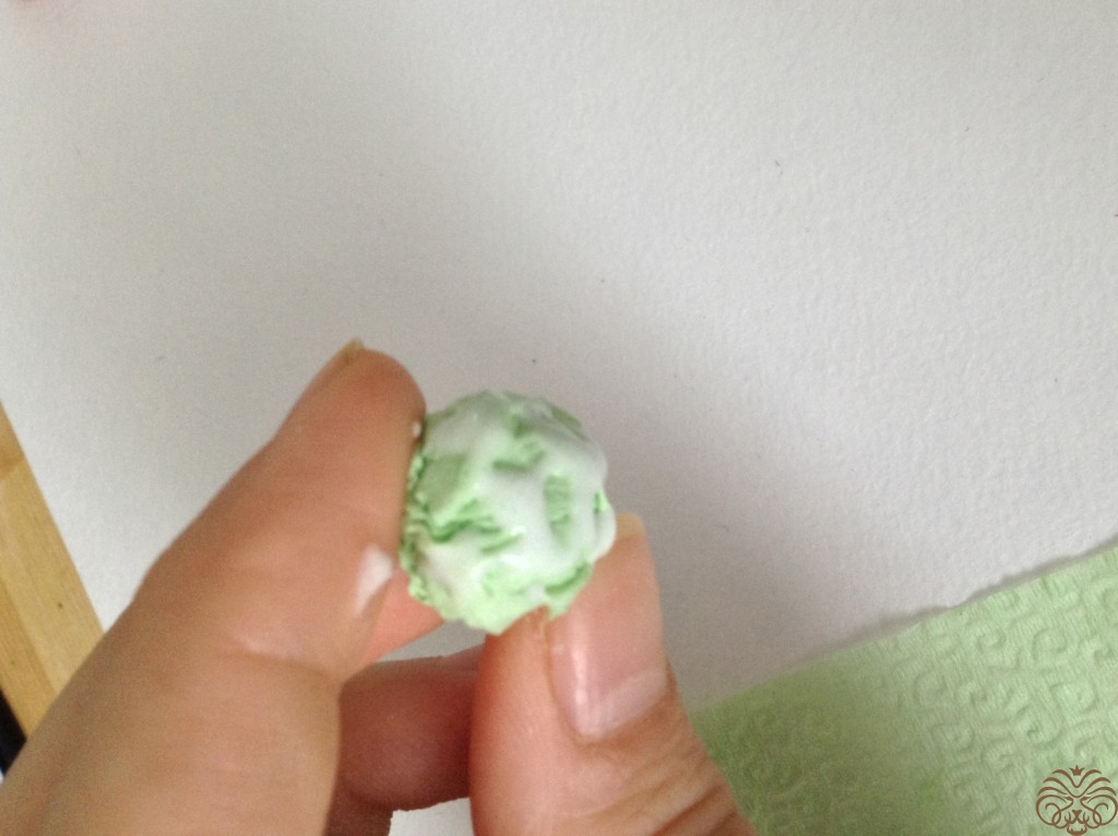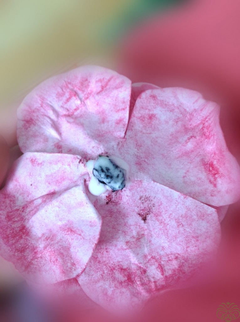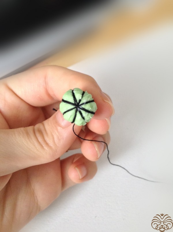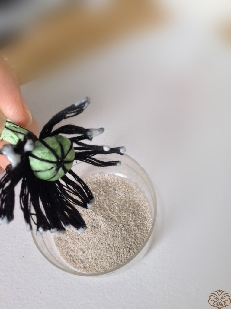 Делаем в середине венчика отверстие. Я делала шилом,но в итоге все равно подрезала ножницами,так что можно сразу ножницами немного прорезать в центре. Нашу заготовку с тычинками обмазываем клеем ПВА и продеваем в центр венчика, затем тоже самое проделываем со вторым венчиком,обрезаем лишнее и промазываем клеем с обратной стороны.