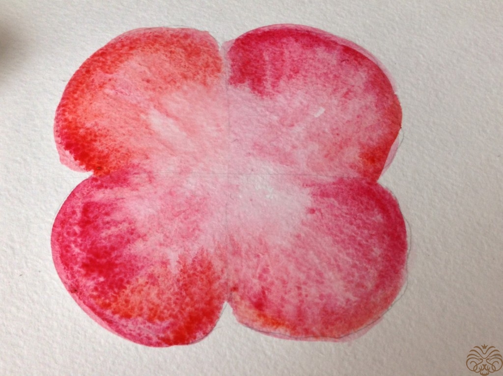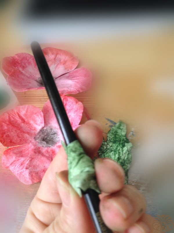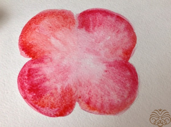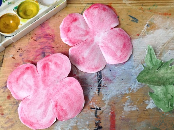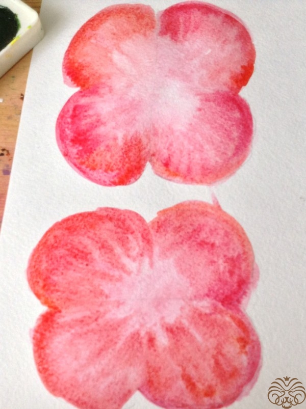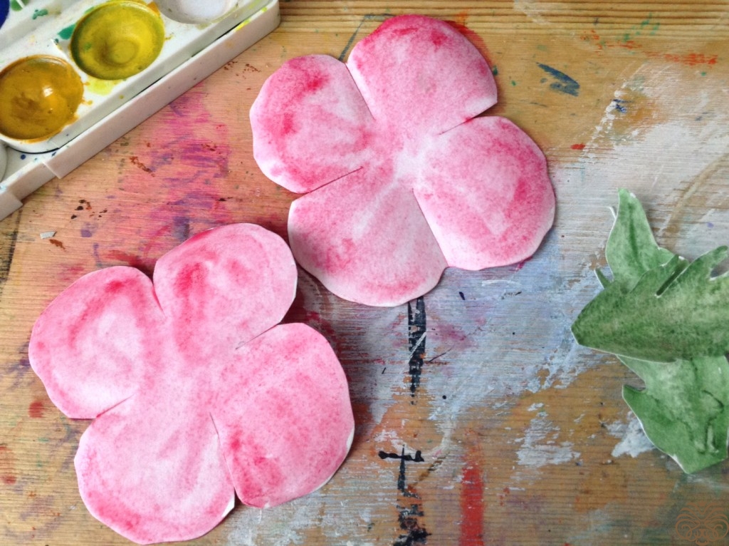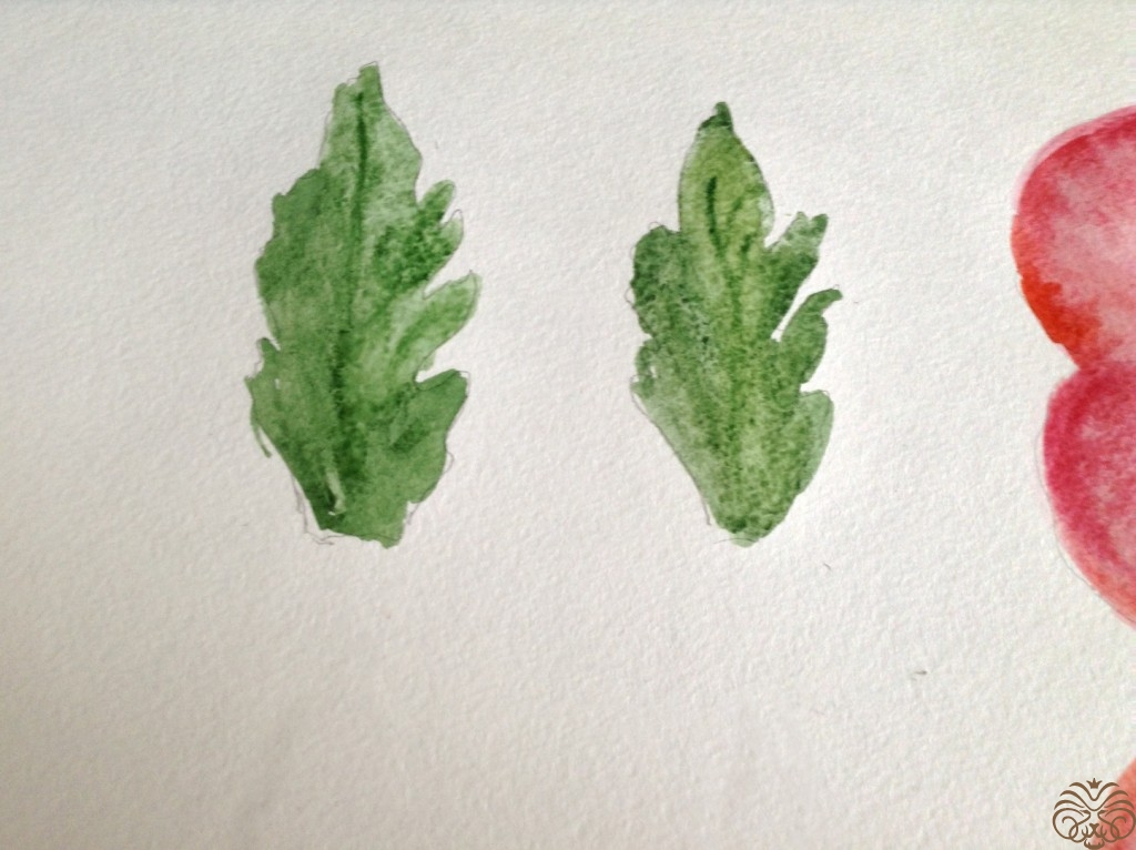 На акварельной бумаге рисуем контур будущих цветов и листиков. Если вы рисуете хорошо, то можете пропустить сей шаг =) На один цветок хватит 2 листиков и 2 венчиков. Начинаем раскрашивать от края к центру,чтобы края были более яркими по сравнению с серединой. Выбираем краску для листьев и тоже тонируем. В центр венчика можно капнуть черной краски. Главное не переусердствовать.